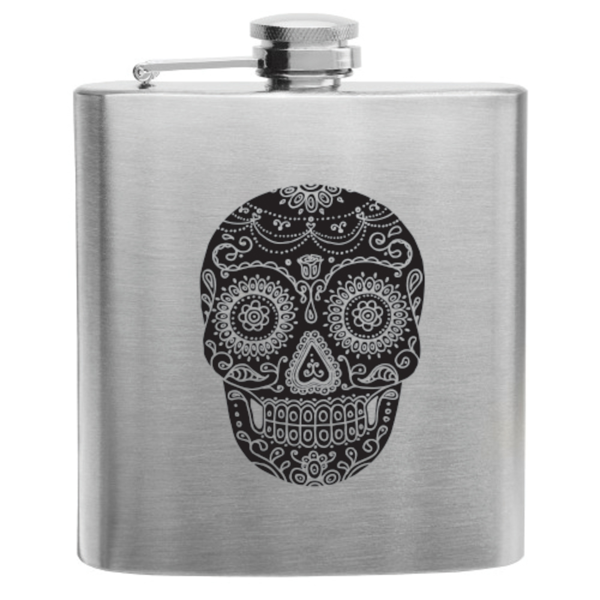 Celebrate departed souls and keep your favorite beverage close with this Dia De Los Muertos Stainless Steel Flask. Featuring a striking sugar skull design, this 6 oz flask is both functional and stylish. Crafted from durable stainless steel with a twist-and-lift lid, it includes a refill funnel for easy use and is perfect for gifting or personal use.