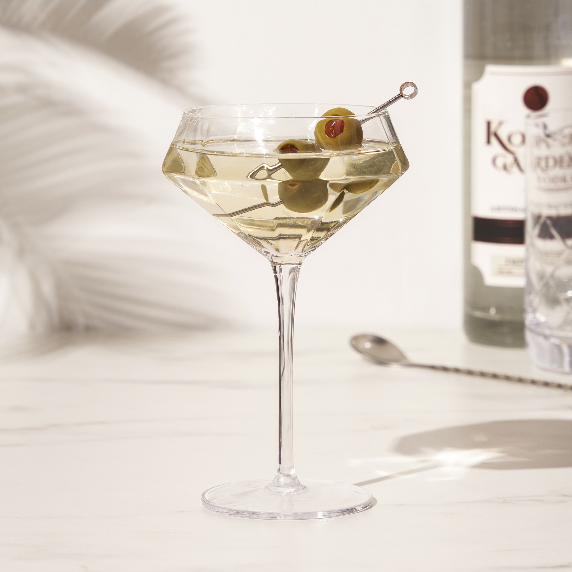 Shaped like sparkling, faceted diamonds, these stemmed martini glasses make cocktails glitter like jewels. The unique diamond design also makes spills less frequent, keeping your gimlet or cosmo safely within the vessel.