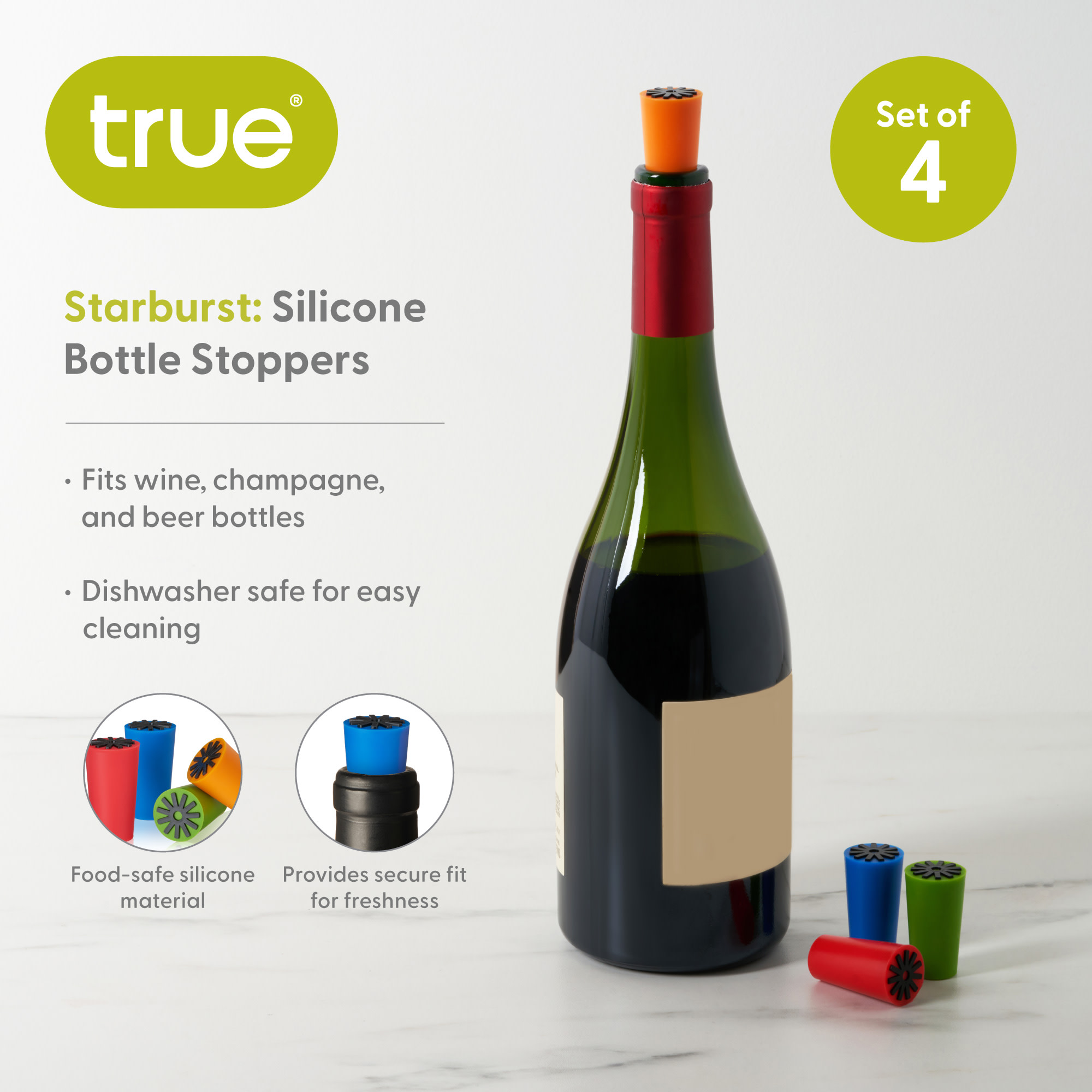Introducing the Starburst Silicone Wine Stoppers by True, a premium solution for preserving the freshness of your favorite beverages. This set of four multicolored stoppers is designed to meet all your sealing needs, from wine bottle stoppers for glass bottles to champagne stoppers, ensuring every drop remains as delightful as the first sip. Ideal as wine cork stoppers, they are a versatile solution, doubling as bottle stoppers for carbonated drinks and beer bottle stoppers. They make excellent wine lovers gifts for women, perfect for any occasion. Whether you're looking for wine gifts for women, fun gifts, or practical gifts for wine lovers, these wine stoppers are sure to impress. For those who cherish their wine, our silicone wine bottle stoppers act as perfect wine savers, maintaining the integrity of your wine's flavor. They are also a great choice for sparkling wine stoppers, ensuring your prosecco or champagne retains its fizz. These wine stoppers are not only functional but also make delightful wine accessories gifts for women. With their secure fit and vibrant colors, these wine toppers for wine bottles are a standout choice among bottle corks and other wine corks.