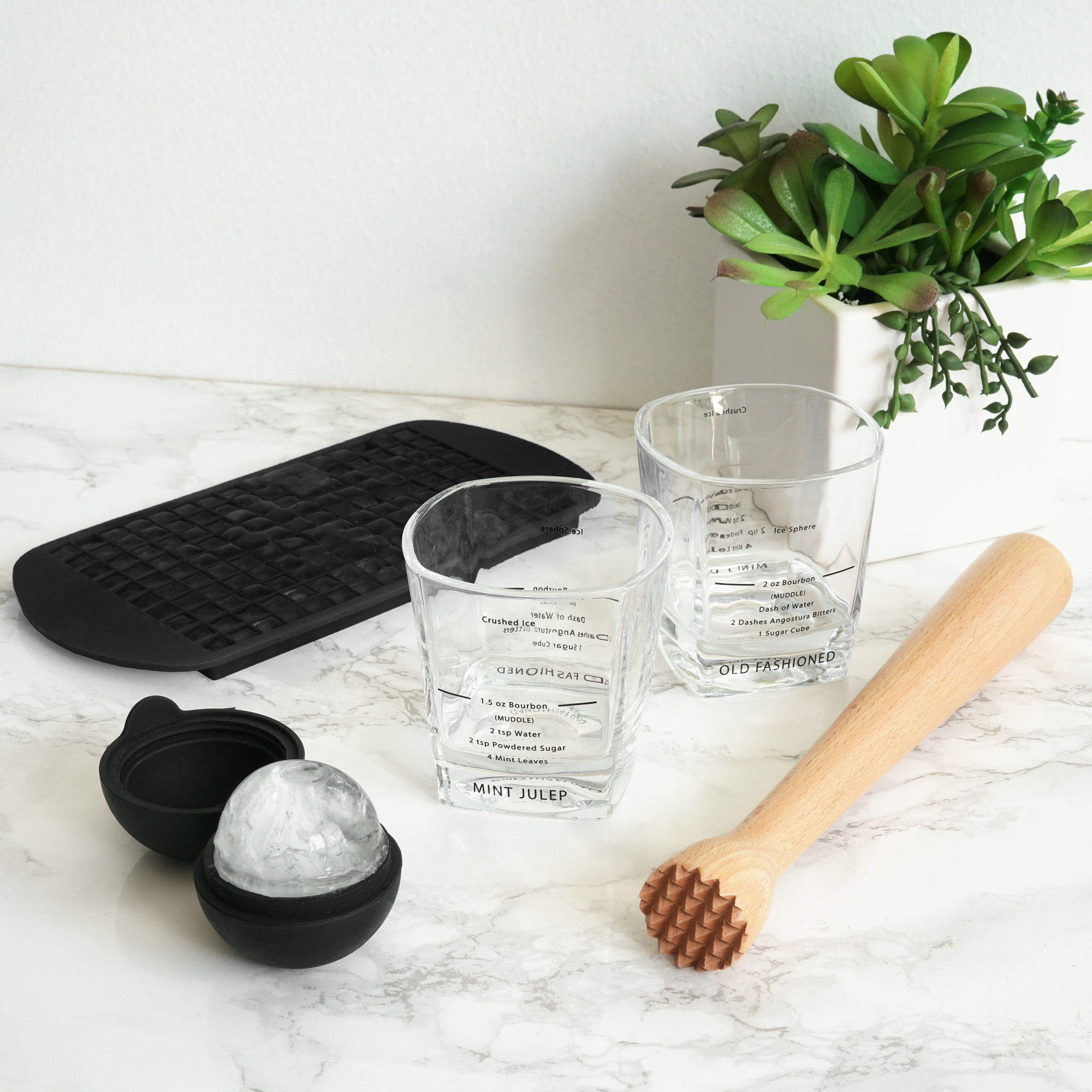 Mojitos, Mint Juleps, Old Fashioneds, and Caipirinhas await you: this 5-piece muddled cocktail set includes everything you need to make classic muddled drinks or invent a few of your own recipes. With two clear lowball tumblers printed with recipes, a wooden muddler, a silicone ice sphere mold, and pebble ice tray, you can host happy hour in style.