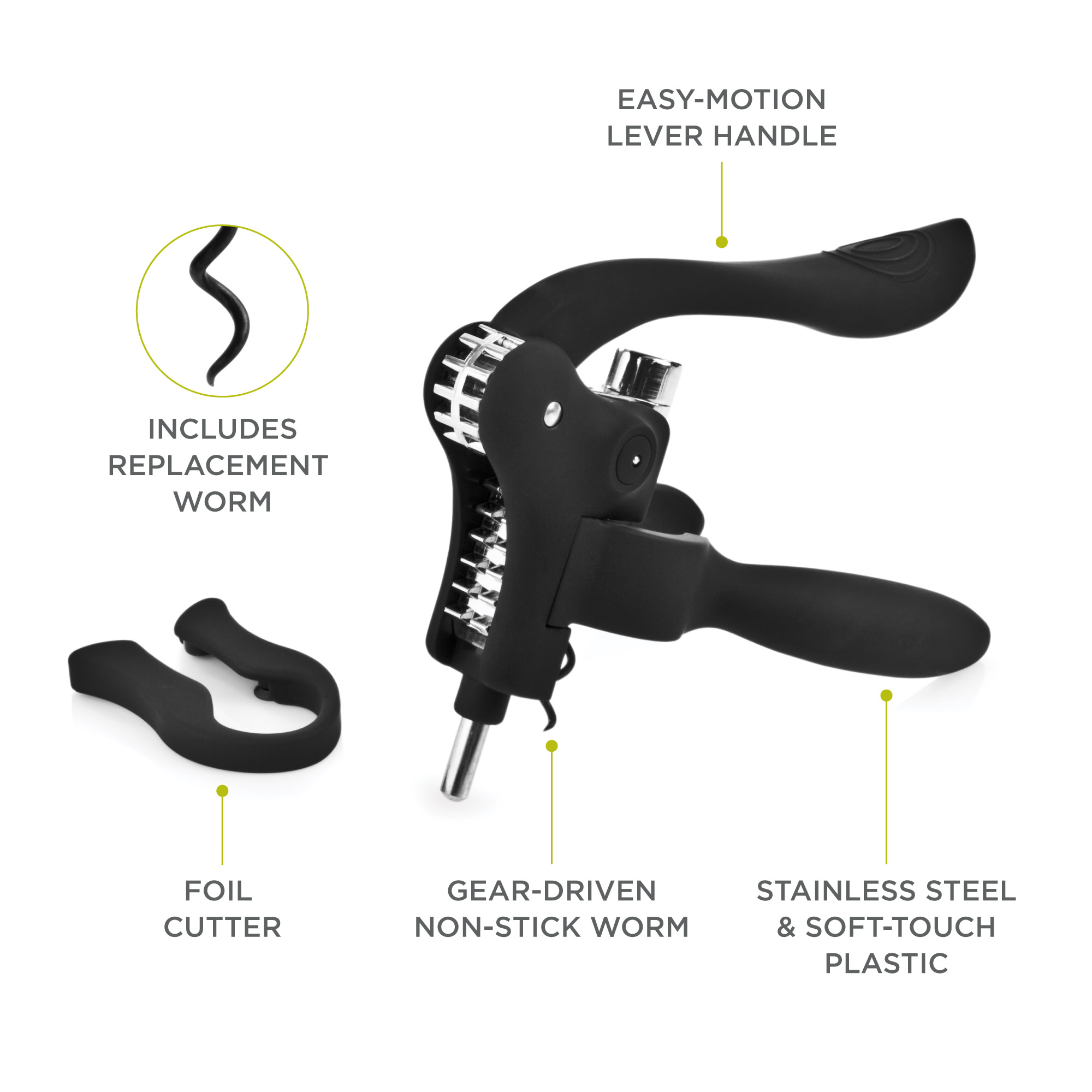 An ergonomic soft-touch body and easy-lever handle define the Virtuoso™ Lever Corkscrew. This classic wine opener stays propped off the counter on a kickstand so it’s always within reach. Just pump the lever down, pull up and your cork is out in one quick, smooth motion. Stainless steel & soft-touch plastic Easy-motion lever handle Includes foil cutter & replacement worm
