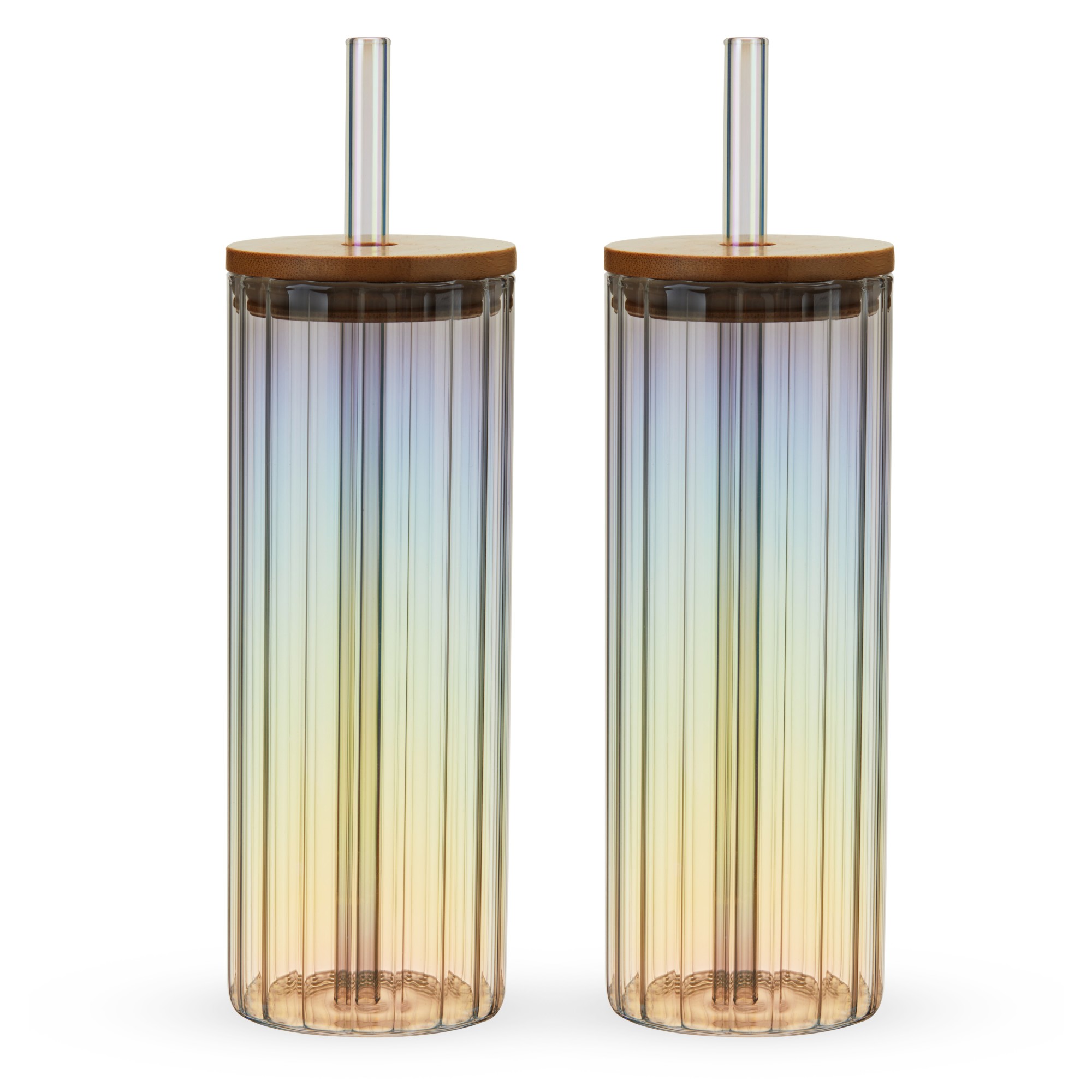 Whether you’re sipping iced coffee, lemonade, or a cocktail, these ribbed glass tumblers with lids and straws are the perfect drinking glasses. The ribbed texture and rainbow luster finish make these a gorgeous way to take your favorite drinks on the go. 16 oz. capacity. Hand wash.