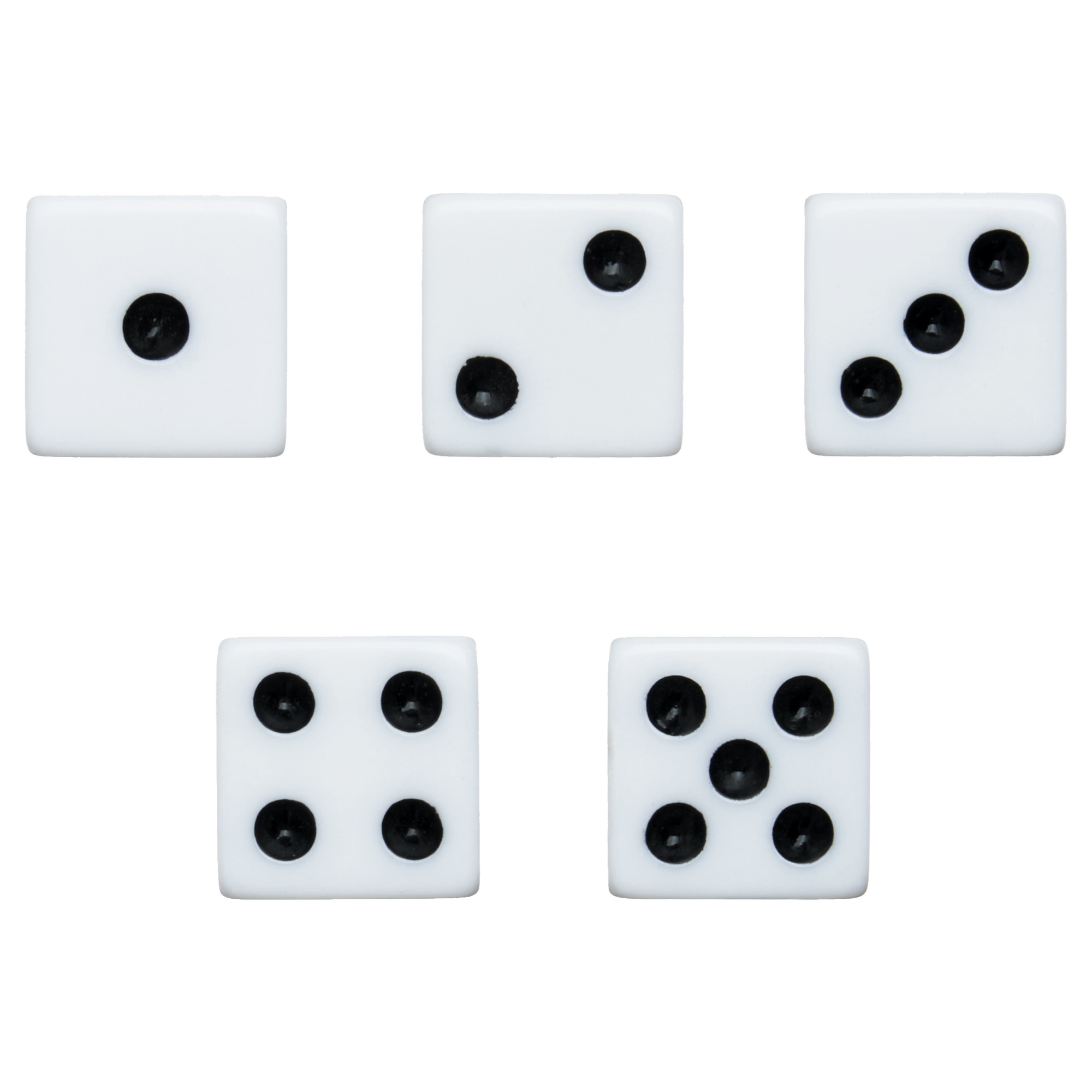 This playing dice set features 5 pristine white dice with clear black markings, making them perfect for any of your tabletop games. Play classic dice games such as Mafia Dice, Drop Dead, Ship, Captain and Crew, Aces, and more with our reliable and stylish white dice set, or embark on thrilling adventures in a role-playing game.