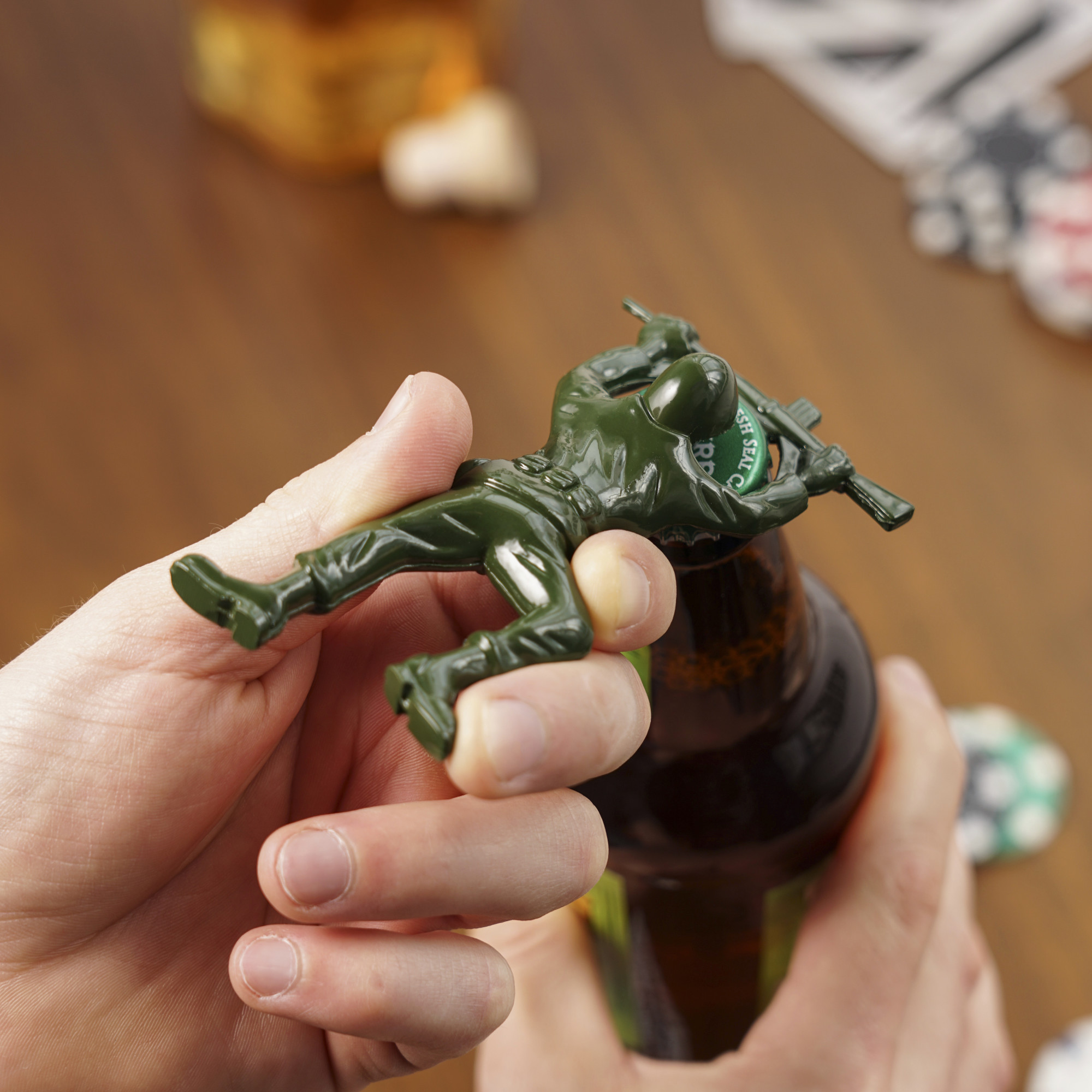 In a unique spin on a classic kitchen tool, this soldier is ready to battle caps at a moment's notice. Just brace his rifle under the cap's edge and leverage him to pop tops with army strength.