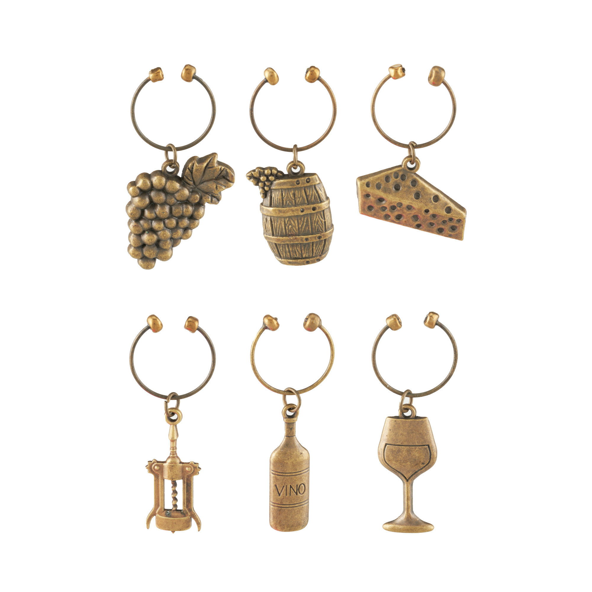 Keep track of your stemware with six vineyard-inspired wine glass charms. Guests love to choose their favorites - each gold-painted piece is unique and makes for a charming party favor.