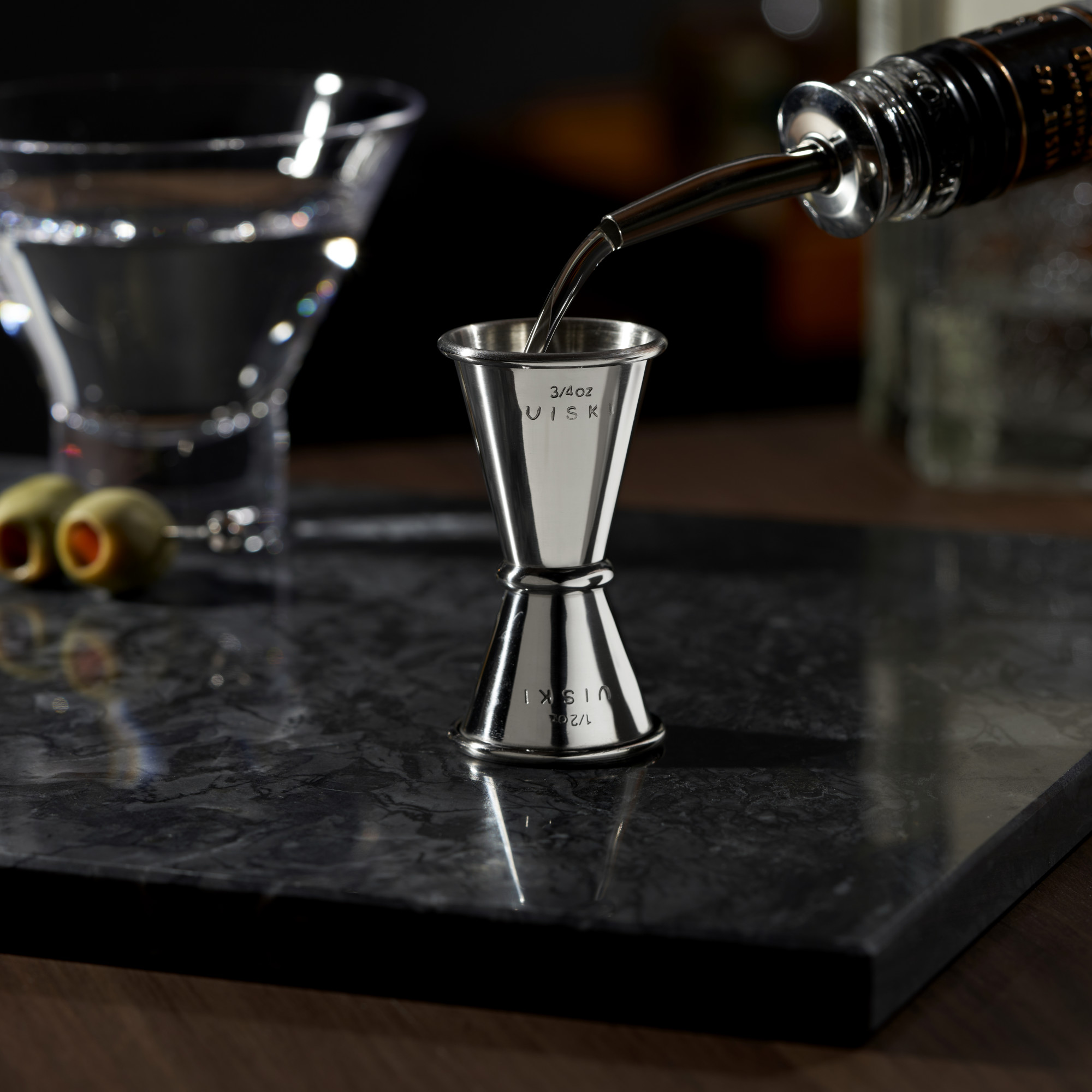 Cast in lustrous stainless steel with a band to separate its .5- and .75-ounce sections, the interior of each side of our professional Japanese-style double jigger is scored with pinpoint mixology measurements of .25 so you can measure small quantities with precision.