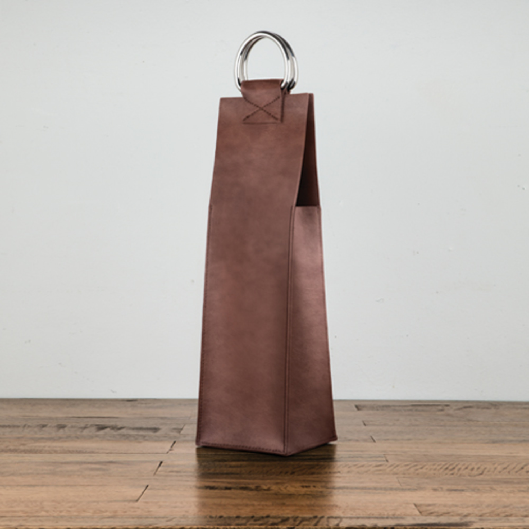 Inspired by travel from city to bustling city, our chestnut-colored faux leather bottle carrier replaces flimsy bottle bags with something that will stand up to a tireless lifestyle. Features a magnetic closure and two sturdy metal handles. Holds 1 standard wine bottle.