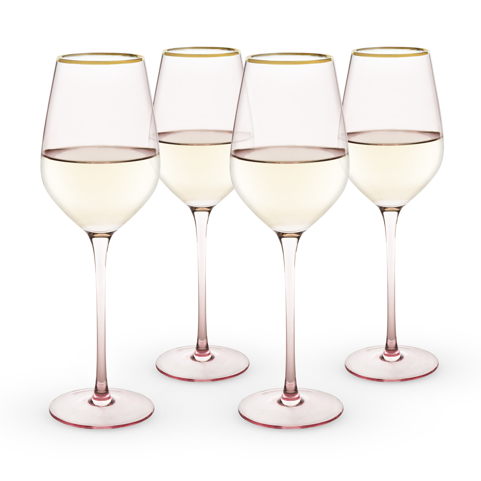 Sip your wine through rose tinted glasses. These pale pink wine glasses give a rosy hue to your favorite Sauvignon Blanc, Chardonnay, or rosé, and the electroplated gold rim adds extra sparkle to your bubbly. Set of 4 rose-tinted crystal white wine glasses. 14 oz. capacity. Gold rimmed.