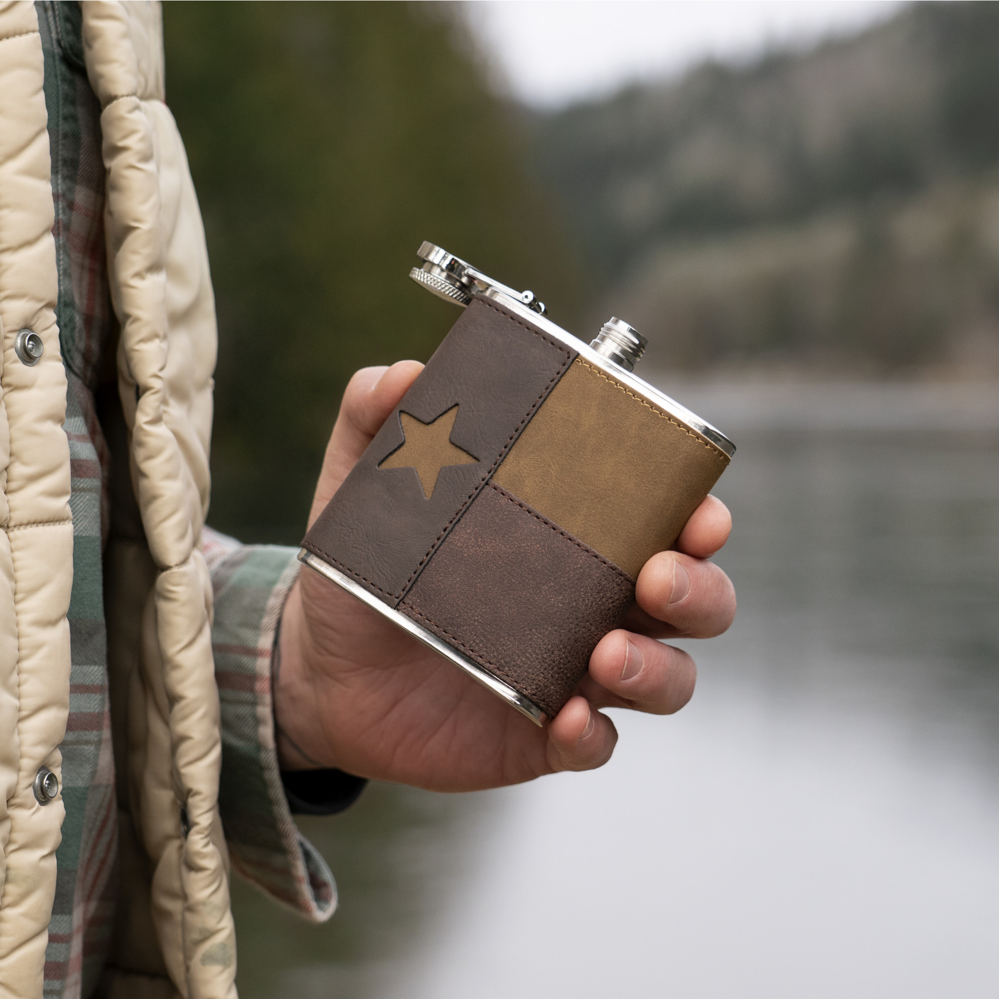 Everything's drunker in Texas. Keep spirits high with this 6 ounce stainless steal flask, outfitted with faux leather and country pride.