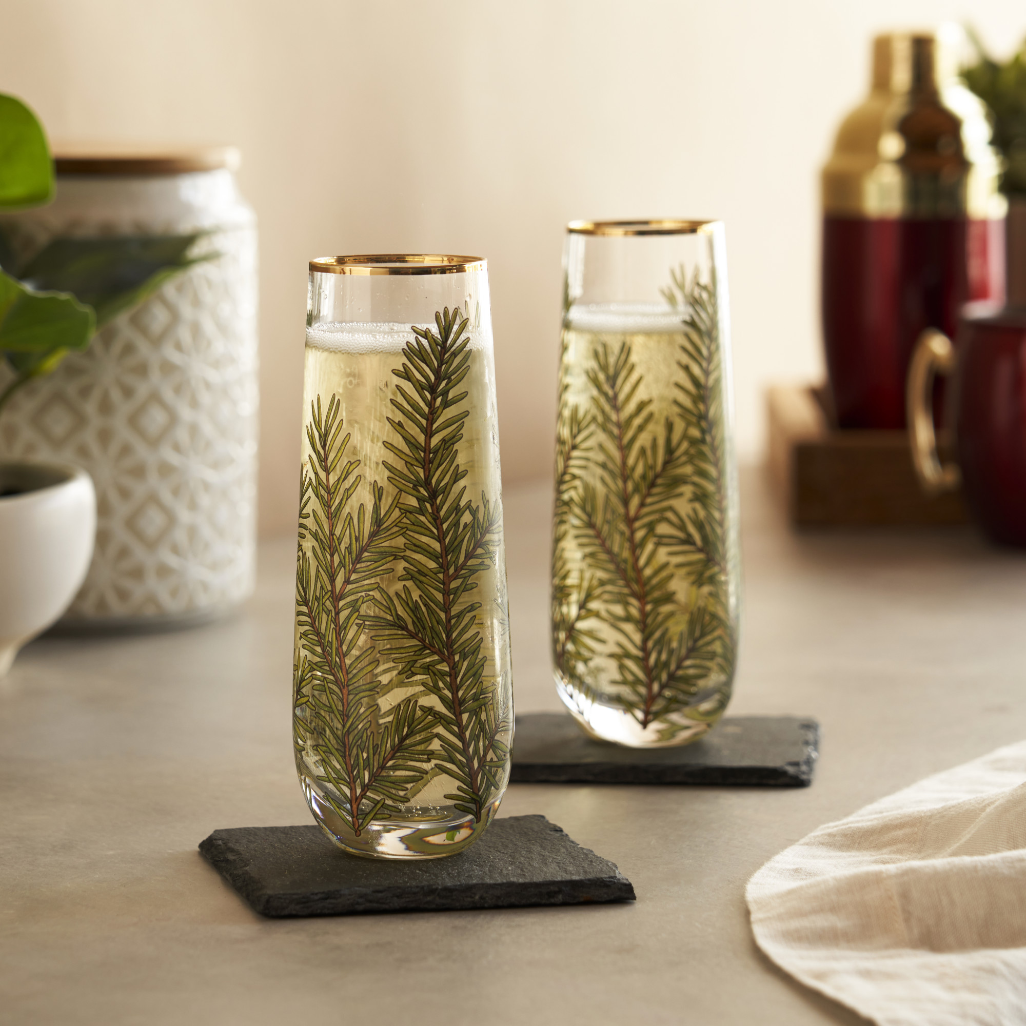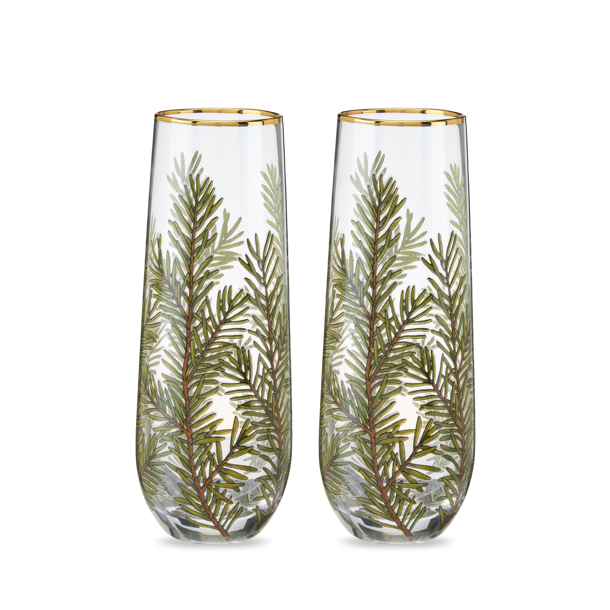 Bring the beautiful flora of winter to your table with this set of woodland champagne glasses. Adorned with evergreen sprigs, these vessels are sure to make a statement all year round.