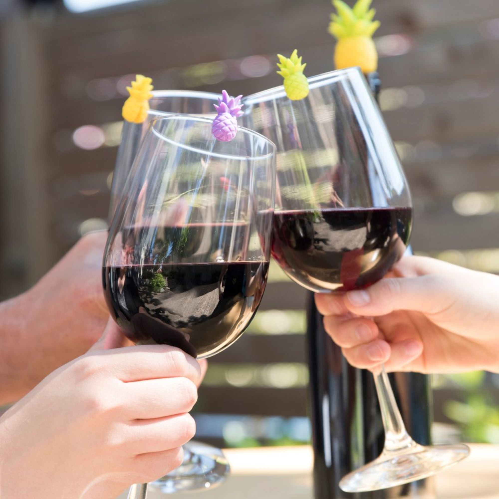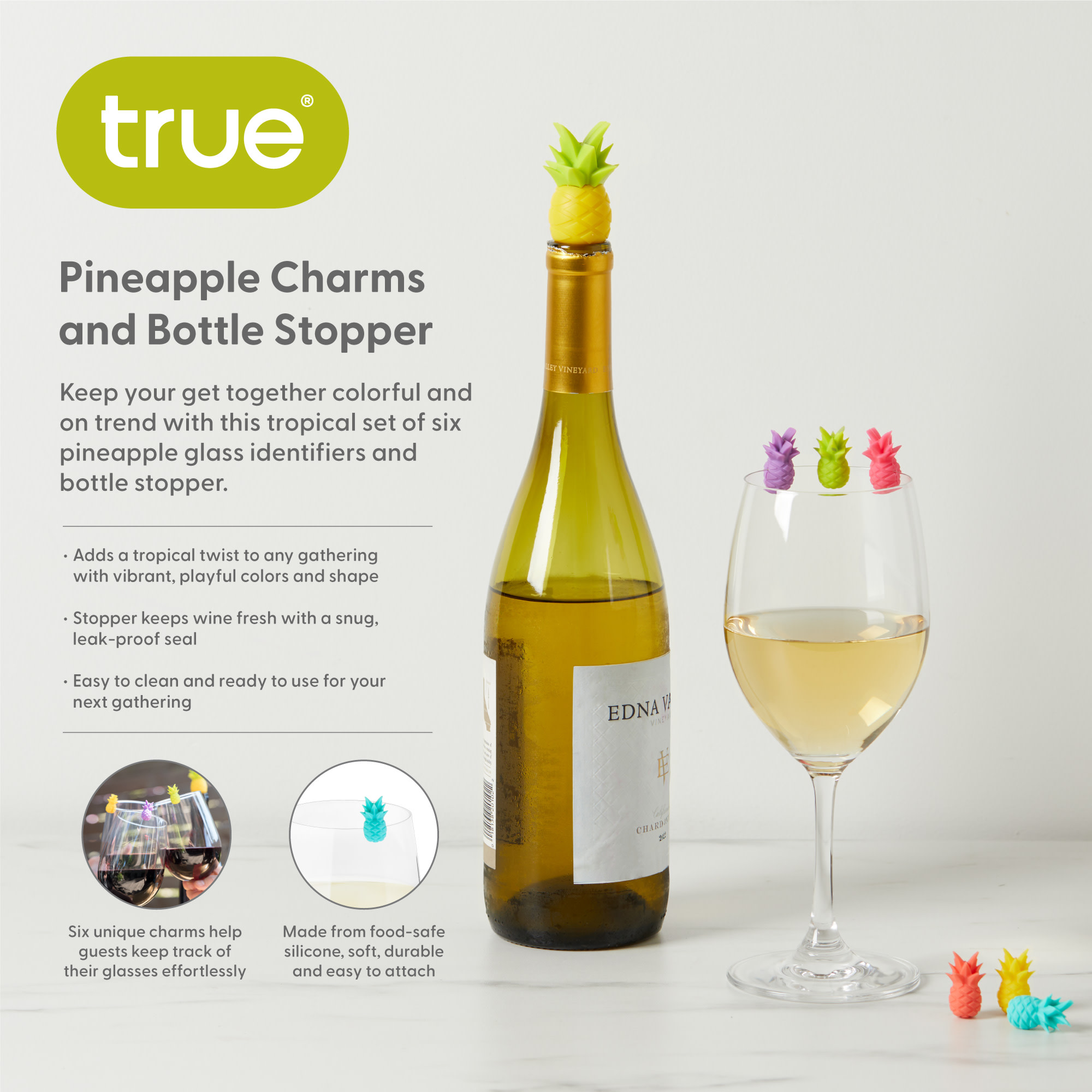 Add a splash of tropical fun to your home bar with the True Pineapple Wine Bottle Stopper with Wine Glass Charms! This multicolor set of 7 includes 6 vibrant wine charms and 1 silicone wine stopper, making it the perfect addition to your wine accessories collection. Whether you're hosting a summer party, bachelorette party, or a cozy gathering at home, this set is sure to impress your guests and keep the good times rolling. Each wine charm in this set is a colorful, playful design that easily fits on the rim of most glasses. These wine glass markers are a great way to distinguish your glass from others, preventing mix-ups and adding a touch of whimsy to your drinkware. With these wine charms, you can keep track of your drink effortlessly, making them ideal for parties, beach gatherings, wedding parties, or any festive occasion. This Wine Bottle Stopper with Wine Glass Charms is a fantastic gift idea for wine lovers and wine enthusiasts. Whether you're looking for wine saver or unique bachelorette party favors, this set has got you covered. The tropical theme is on-trend and perfect for any fun-loving individual who enjoys a good glass of wine.