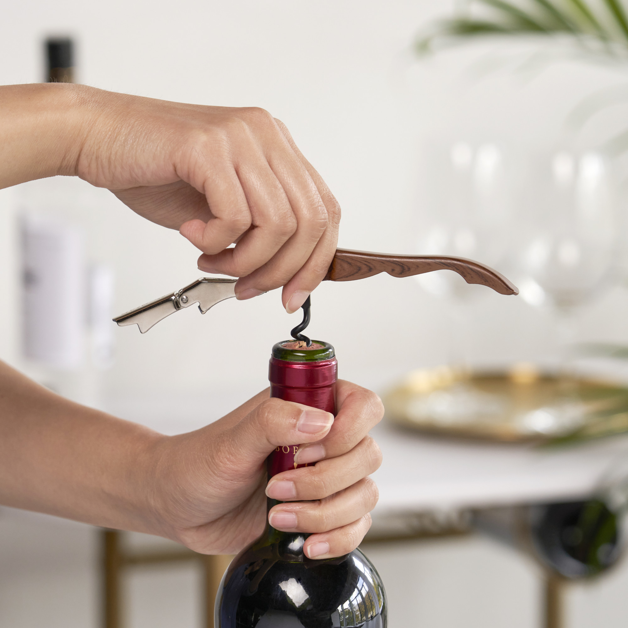 Uncorking is effortless thanks to the superior double-hinged design and non-stick worm of the Truetap™ Double-Hinged Corkscrew. Complete with an integrated bottle opener and serrated foil cutter, it’s our most iconic wine opener. Stainless steel Double-hinged Riveted wood handle 5-turn non-stick worm serrated foil cutter