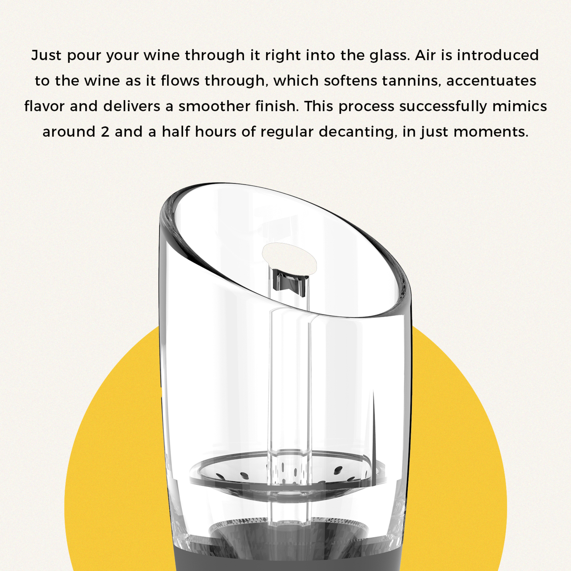 Unlock the full flavor of your wine with Aereoâ„¢. This handheld aerator is super easy to use. Just pour your wine through it right into the glass. Air is introduced to the wine as it flows through, which softens tannins, accentuates flavor and delivers a smoother finish. This process successfully mimics around 2 and a half hours of regular decanting, in just moments.