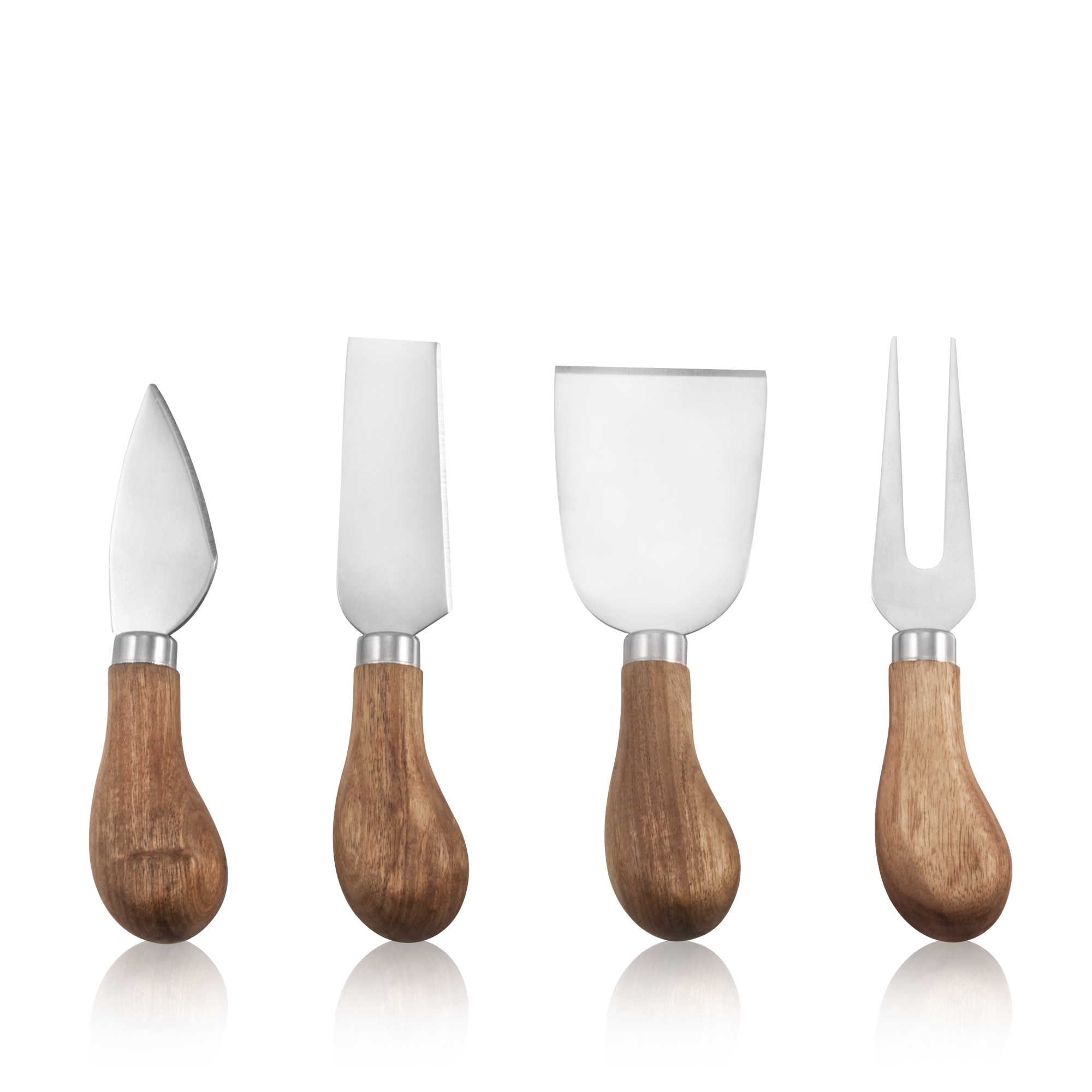 Crafted with precision and elegance, this Gourmet Set of 4 Cheese Knife Set by True is an indispensable addition to your charcuterie board accessories. This cheese tools set is a perfect blend of functionality and style, making it a must-have for anyone who enjoys the art of serving cheese. The set includes a small spade knife, ideal for slicing and spreading soft cheeses, a narrow blade for hard cheeses, a flat chisel for crumbly varieties, and a stout serving fork for those who prefer to fork their cheese. Fashioned from superb quality stainless steel, the blades are designed to last, whether you're slicing brie or parmesan. The handles, measuring 2.25", are made of wood, giving these knives a luxurious look that is sure to impress your guests. These charcuterie knives double as stunning charcuterie serving utensils, elevating the aesthetic appeal of your cheese board. This charcuterie knife set is not just about aesthetics. The knives are dishwasher-safe, making clean-up a breeze. These cheese knives for charcuterie boards are as practical as they are beautiful, providing an efficient solution for cheese lovers. Perfect for entertaining or hosting happy hour, weddings, housewarming parties, Christmas, and more.