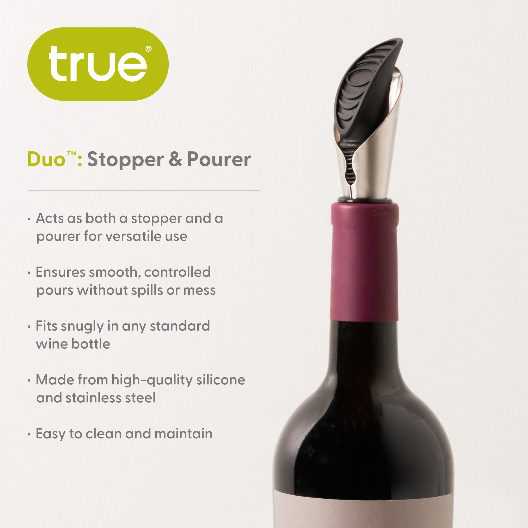 Use the Duoâ„¢ Stopper & Pourer separately to pour drip-free from one bottle as you preserve another. Or combine both to keep one wine plugged between pours. Each piece fits securely in any standard bottle, making them versatile together or separate.