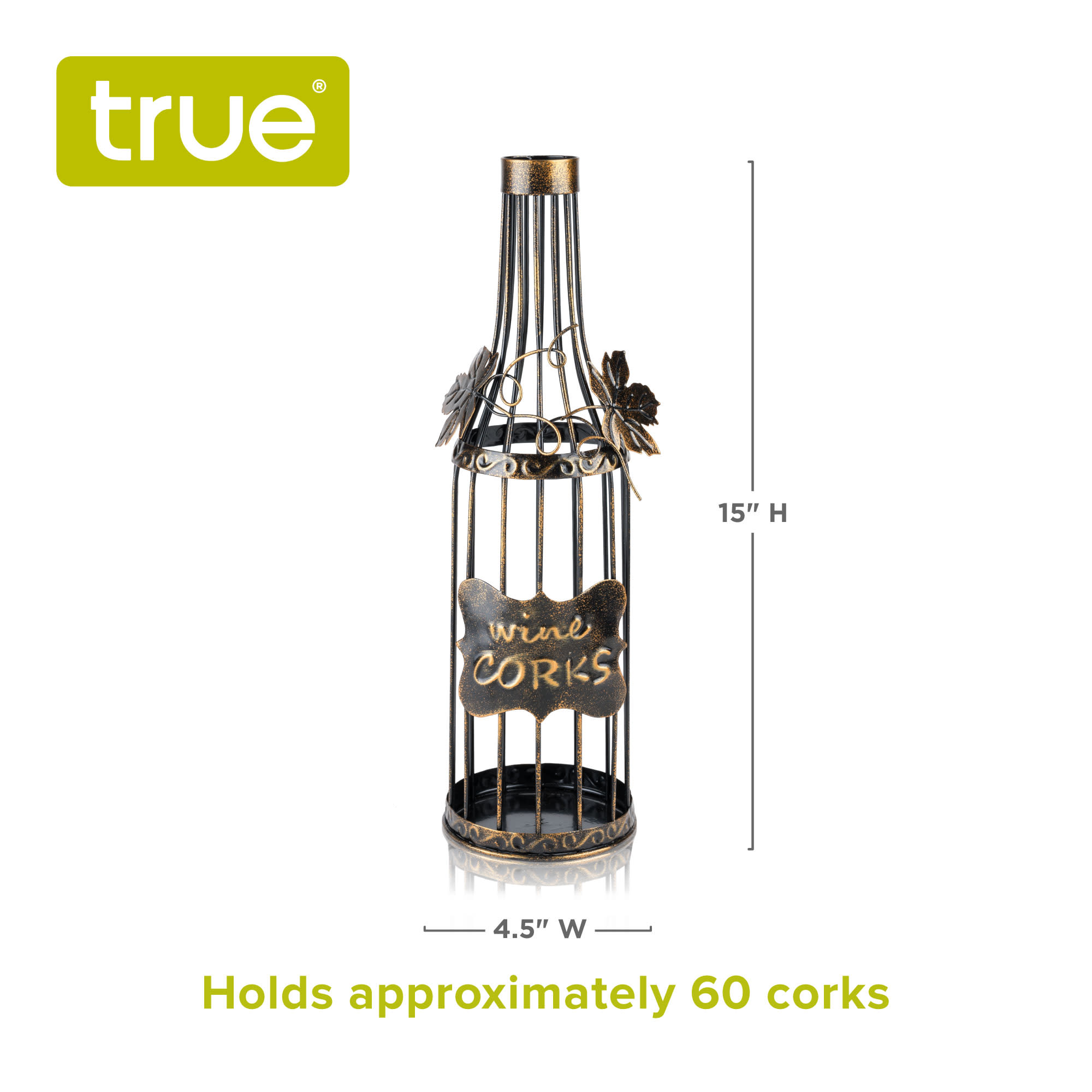 Form and function intertwine to create this metal cork holder. Its quaint wine bottle shape, bronze-tinted finish, and clever label are all sure to charm. Holds up to 60 corks to satisfy even the heartiest wine lovers. Crafted from sturdy metal. Makes a great gift for design-conscious wine lovers. Holds 60 corks, measures 15" H x 4.5" W, bronzed stainless steel, cage design.