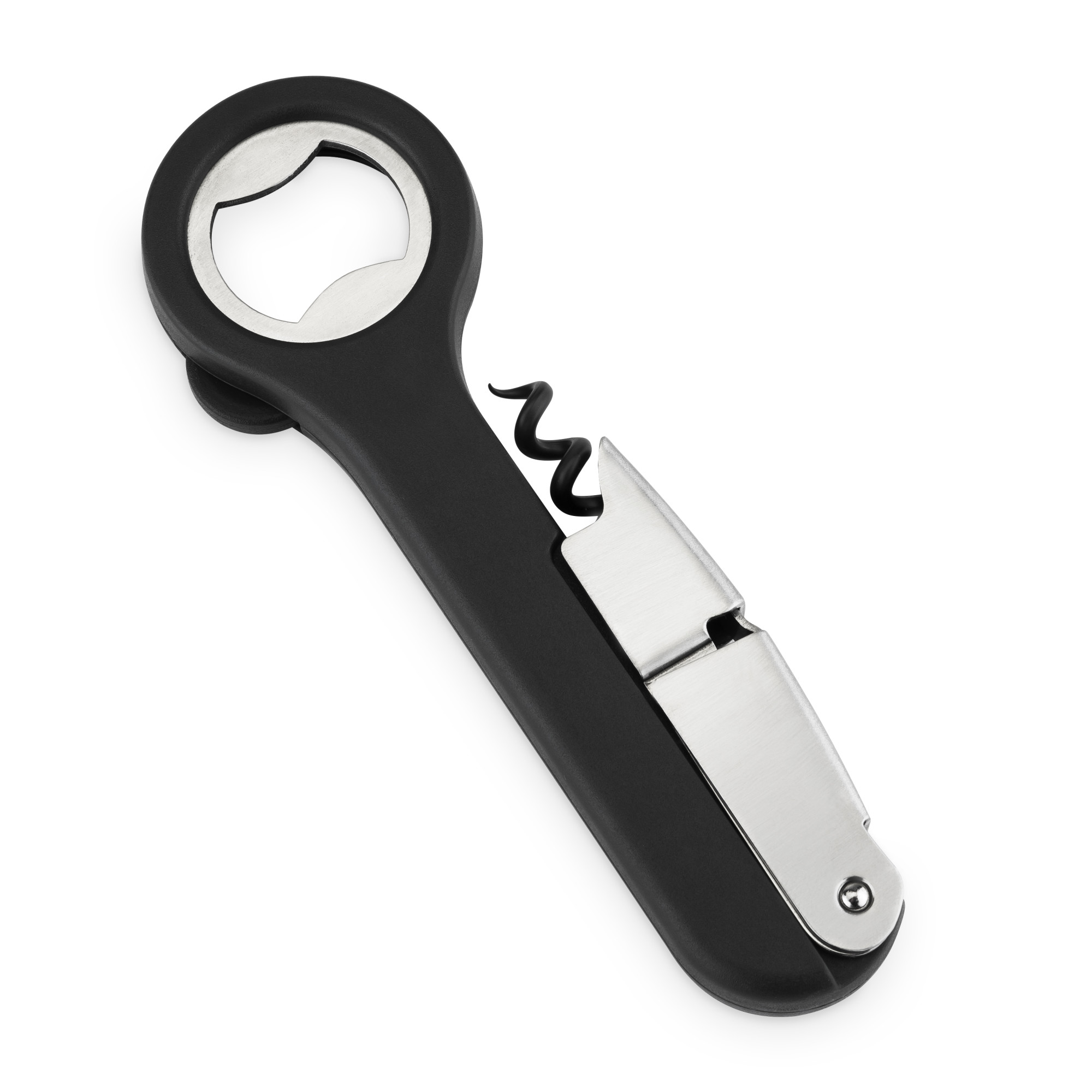 While compact, this corkscrew offers much more than meets the eye. The double-hinged design and non-stick worm make opening any wine bottle easy. This gadget works overtime as a bottle opener and a foil cutter. Store on your fridge with its magnetized body. Double-hinged stainless steel tap Non-stick coated spiral worm 3-blade foil cutter Stainless steel bottle opener Magnetic Body