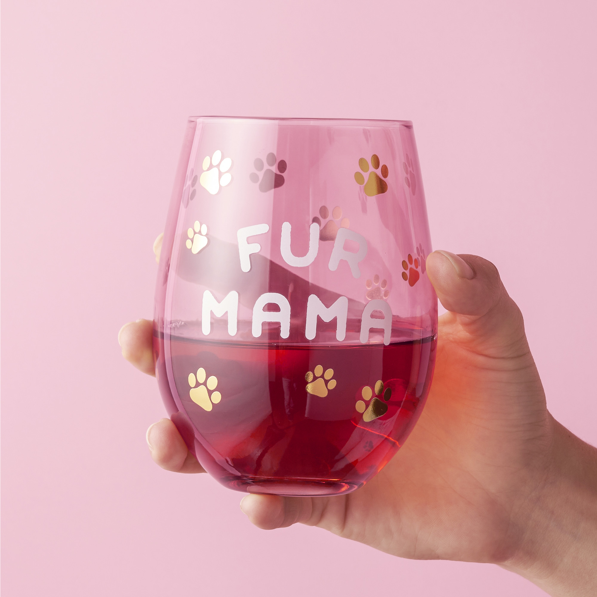 Get your paws on this adorable "Fur Mama" stemless wine glass! Whether you're a dog, cat, or any pet mama, this glass is perfect for celebrating your fur babies while enjoying your favorite wine. The pink-tinted glass and paw print pattern complete the charming theme.