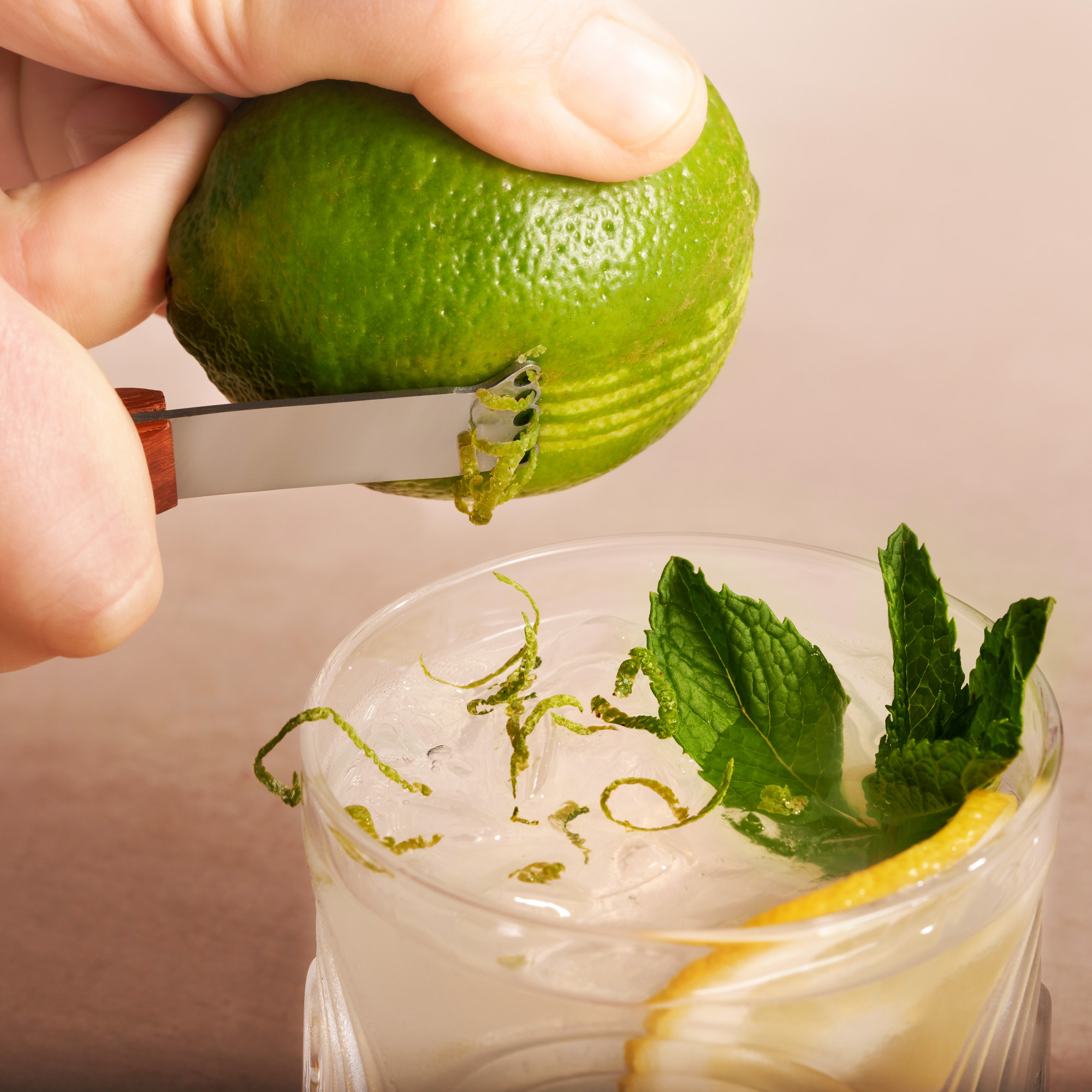 Finish handcrafted cocktails with a professional twist of citrus. Riveted wood with polished exposed grain provides ergonomic support while a stainless steel zester slices segments of citrus peel into delicate garnishes. Most suitable for oranges, lemons and limes. Hand wash recommended.