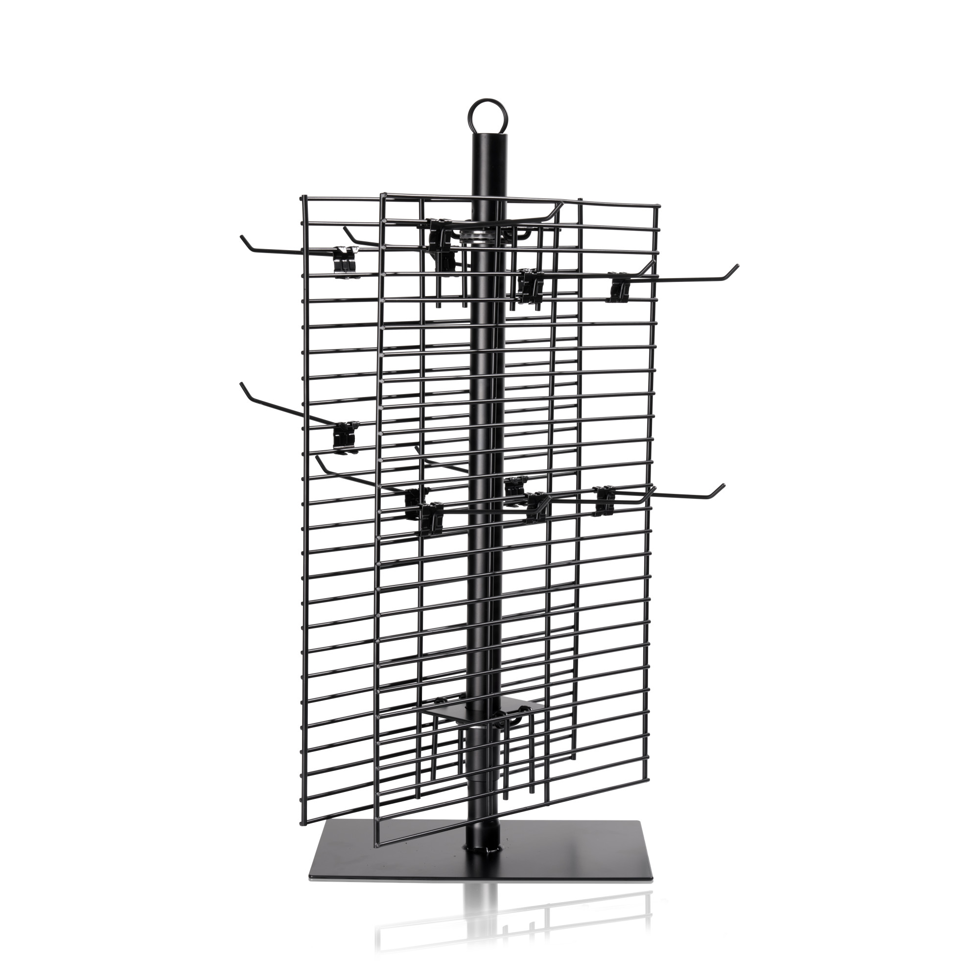 This countertop spinner rack offers a sleek, efficient solution for displaying a variety of barware, accessories, and other impulse buy products. With a compact design, sturdy black finish, and 12 included hooks, it maximizes space while providing easy access to items. Ideal for retail stores, it keeps merchandise organized and visible to customers.