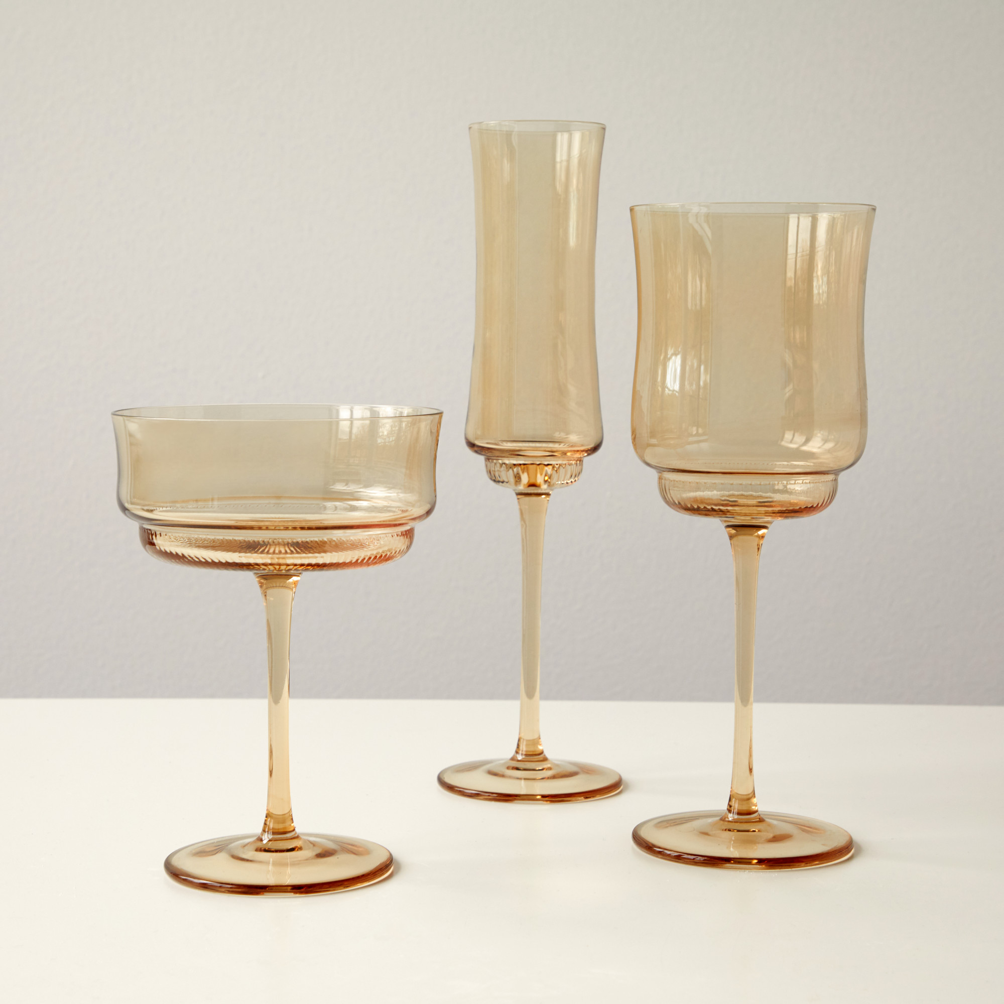 With a charming vintage silhouette and amber-tinted hue, these stemmed coupes bring visual interest to your home bar or dinner parties. They’re perfect for a mid-century modern style home or as a unique gift for cocktail lovers with a vintage aesthetic. Set of 2 stemmed cocktail coupes. Amber-tinted color. Holds 9 oz.