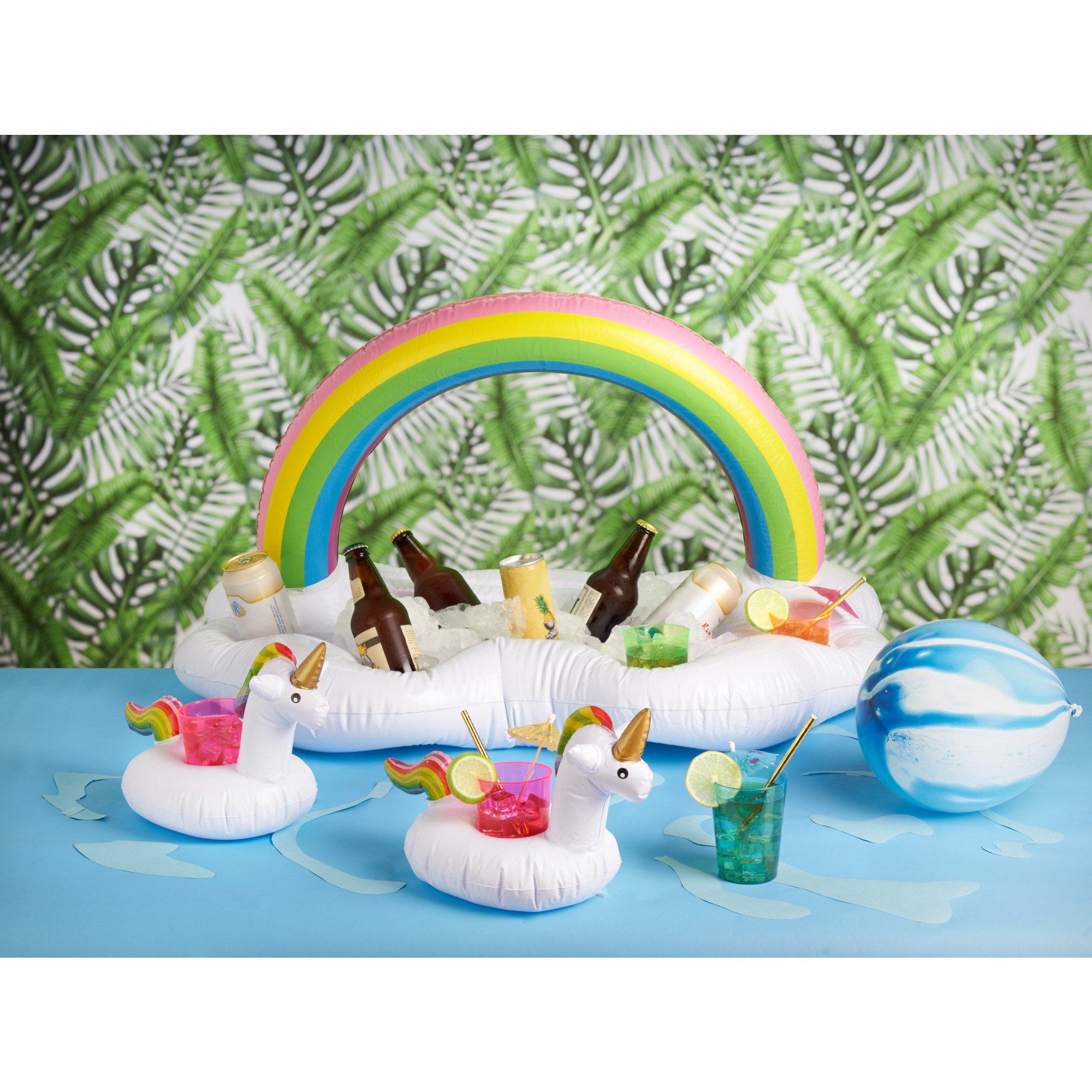Create your own swim up bar with this rainbow drink floatie. With a rainbow and cloud inflatable pool float that can hold 4 cans, your guests can keep splashing around while they get another drink.