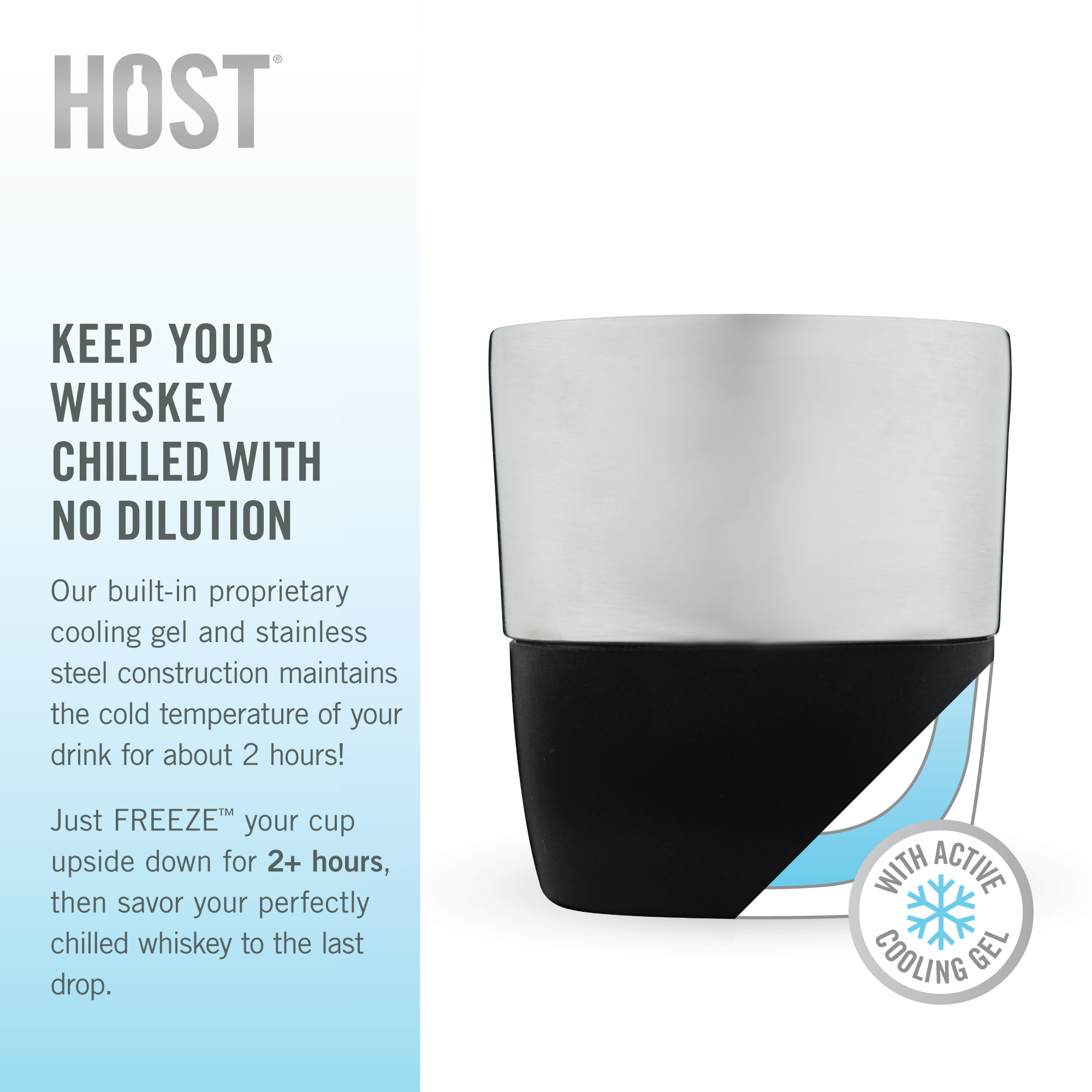The Whiskey FREEZEâ„¢ you know and love, now in stainless steel and with more room. The Whiskey FREEZEâ„¢ Pro keeps your favorite spirit refreshingly chilled for 2 hours. Made from double-walled stainless steel filled with active cooling gel, it keeps your liquor deliciously cold without ice, so you can enjoy your Bourbon to the fullest. Say no to watered down Scotch!