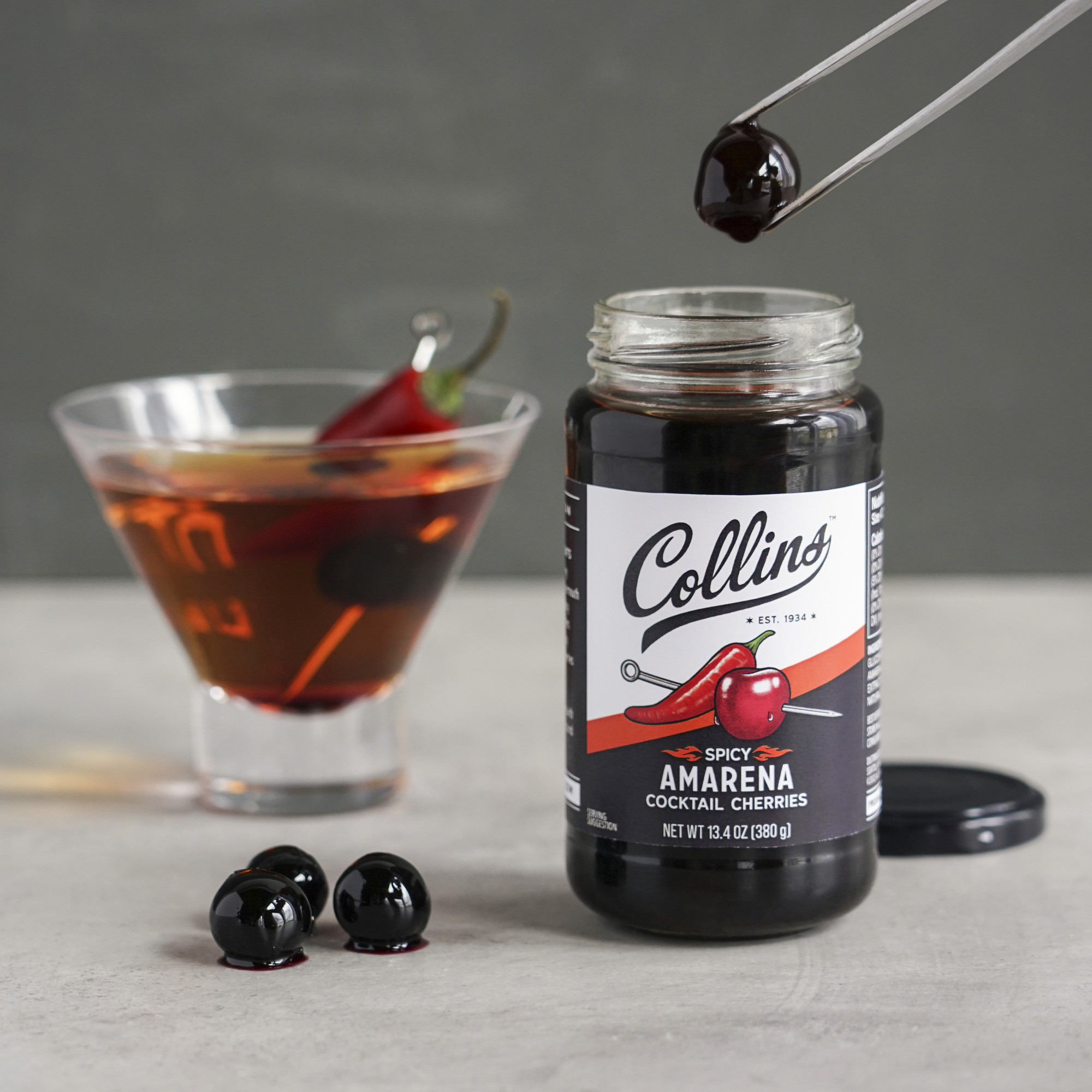 Collins Spicy Amarena Cherries are the perfect way to elevate an Old Fashioned or Manhattan. Crafted from Italian cherries in sour cherry juice, these cocktail cherries have a hint of chili that adds a little kick to your drink. Collins garnishes and mixers are always made from real ingredients for real flavors—taste the difference. Ingredients: Cherries, Glucose-Fructose Syrup, Sugar, Amarena Juice, Citric acid, Extract of carrot and hibiscus, chili natural flavoring.