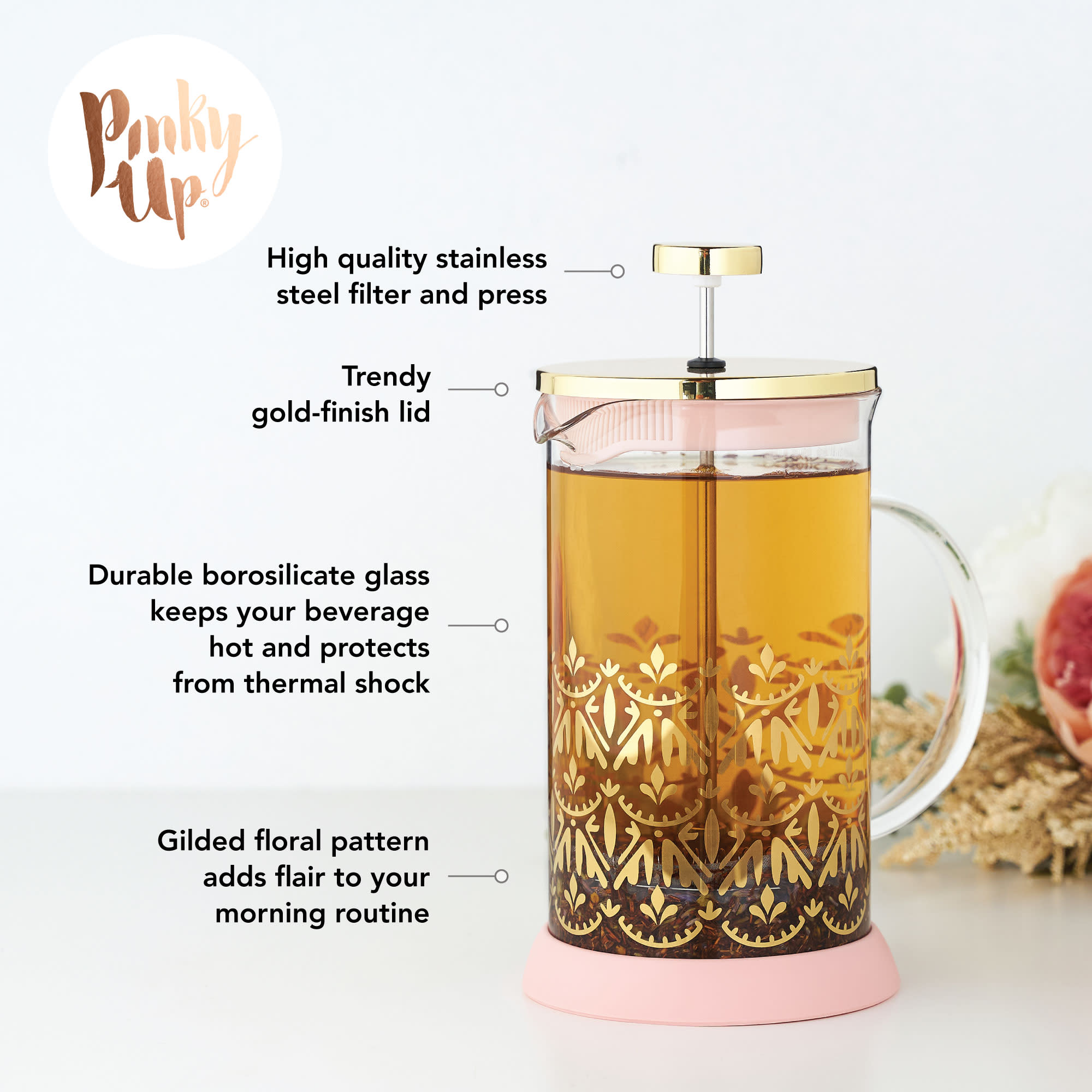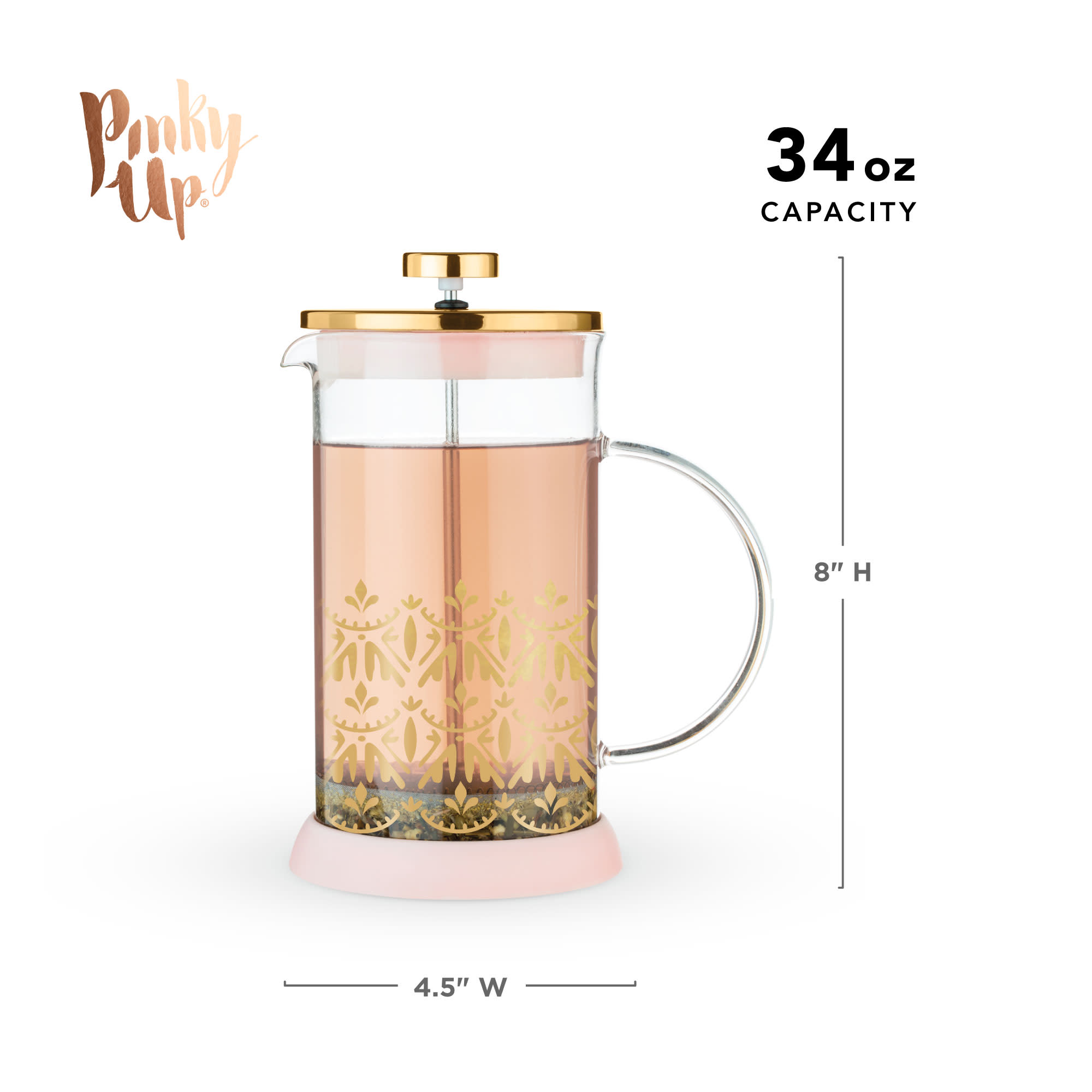 What better way to serve tea to all your friends (or multiple cups for yourself!) then with the Riley Tea Press Pot by Pinky Up! With its 34 oz capacity, stainless steel filter and press, and trendy gold lid you'll be serving tea to your squad in a flash! Gold stainless steel Borosilicate glass Leaf tea infuser or coffee press 34 oz capacity
