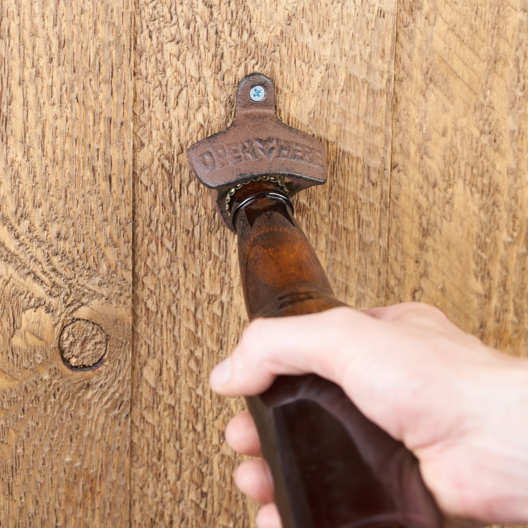 When in doubt, go old school. Made from wrought iron, this wall-mounted bottle opener is the perfect way to crack open a cold one. The faux-rusted finish gives this iron bottle opener vintage appeal—perfect for wild west themed decor.