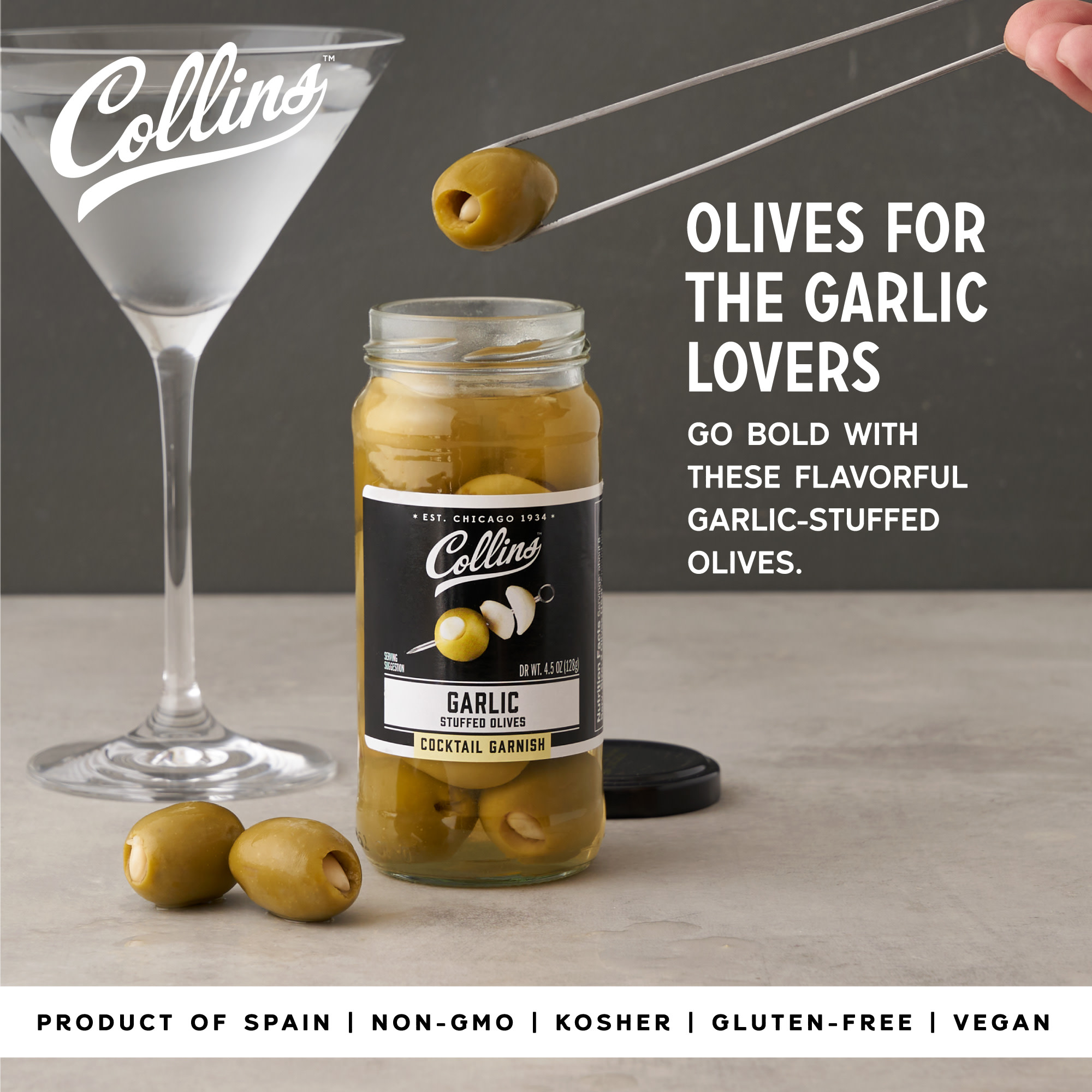 Maybe the traditional Martini isn’t enough anymore, so it’s time to mix things up. Or maybe you’re just a fan of everything garlic. Whatever it is, these garlic-stuffed olives allow for delicious cocktails that leave a lasting impression. All olives are hand-packed from Greece, with a natural ingredient list. The olives are generously-filled with garlic that is rich in flavor and character. This garlic flavor blends beautifully with the sweet vermouth of a Martini, which makes it a cocktail you just have to try. Now, your favorite cocktail shouldn’t be carelessly thrown together; it needs to be presented well too. The Gourmet Garlic Queen Olives are the perfect garnish for adding authenticity and character to any cocktail or drink. The Collins Way – The year is 1934, and on North Clark Street in Chicago, Collins Brothers have just opened their doors to sell a simple metal bottle opener and homemade grenadine. Since then, Collins Brothers has expanded their range to include a variety of garnishes, mixers, and syrups. Being recognized for outstanding service has remained at the forefront of our brand philosophy, and always will. In the unlikely event that you’re not satisfied; we’ll replace your olives or return your money. Fantastic Gift – These gourmet olives are ideal for Christmas, birthdays, anniversaries, or as a special treat for that cocktail-lover in your life. They are also the perfect item to take to any dinner party or evening gathering.