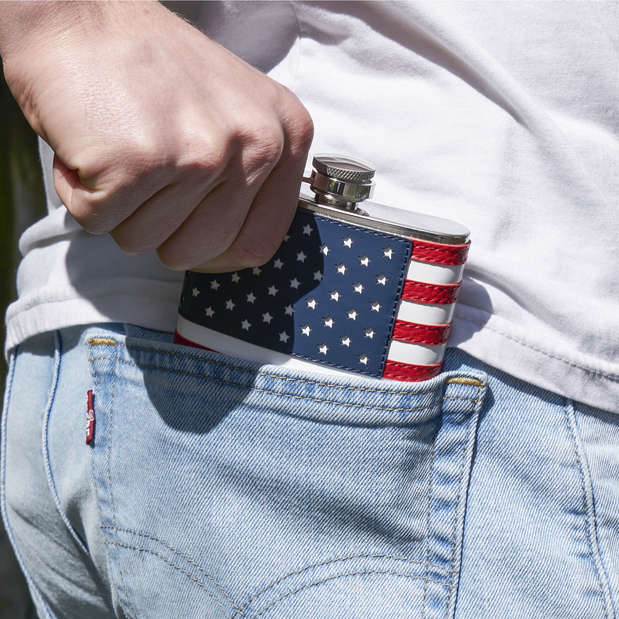 Show off your patriotic pride with the American Flag Flask. Wrapped in a vegan leather American flag design, this 6 oz stainless steel flask combines durability with standout style. Featuring a secure twist-and-lift lid and an included funnel for easy refills, it’s the perfect accessory for on-the-go celebrations or gifting.