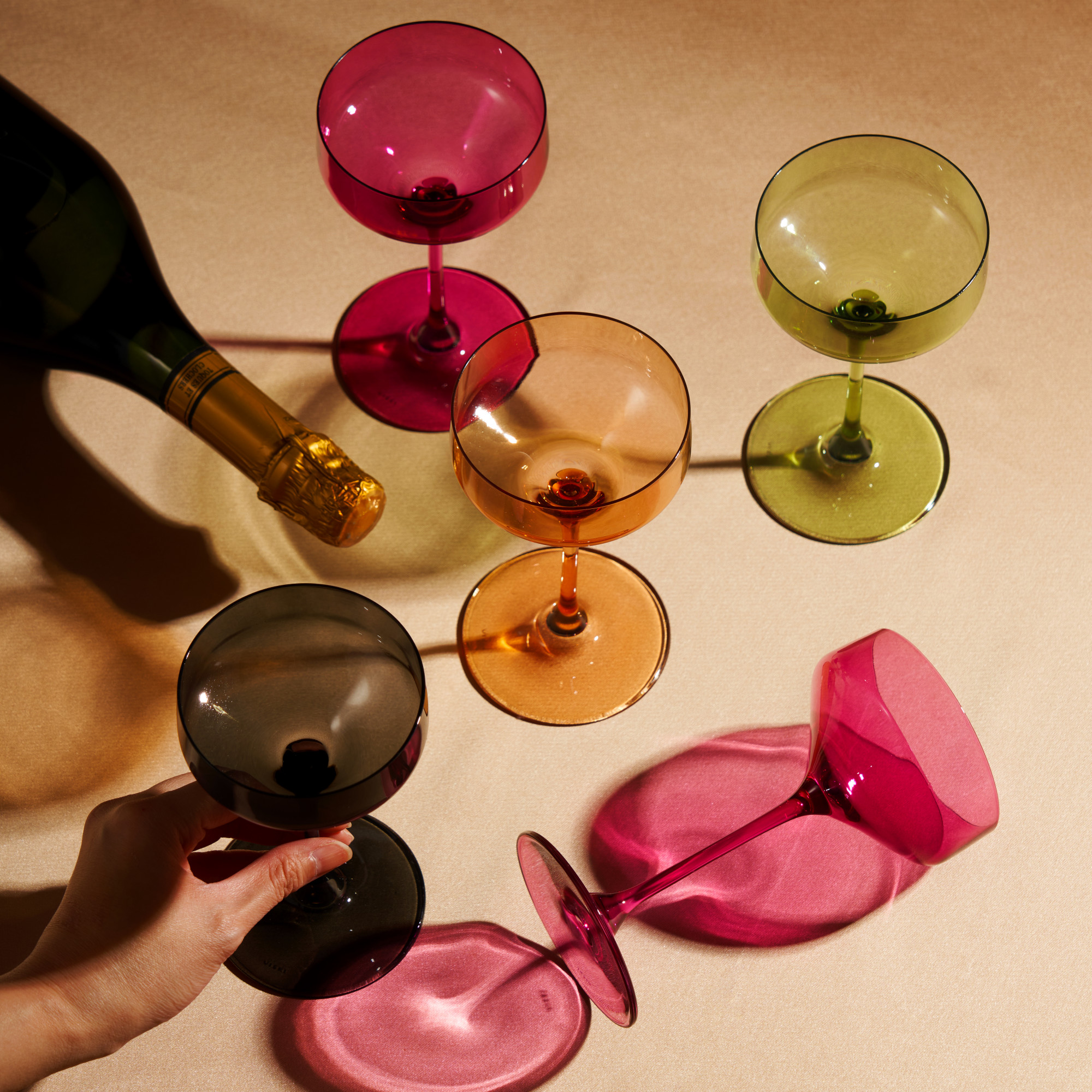Crafted from European crystal with a gorgeous smoke gray hue, these coupe glasses bring a moody elegance to shaken cocktails. Add some color to your glassware collection with these stemmed cocktail glasses. 6.5 oz capacity. Hand wash recommended.