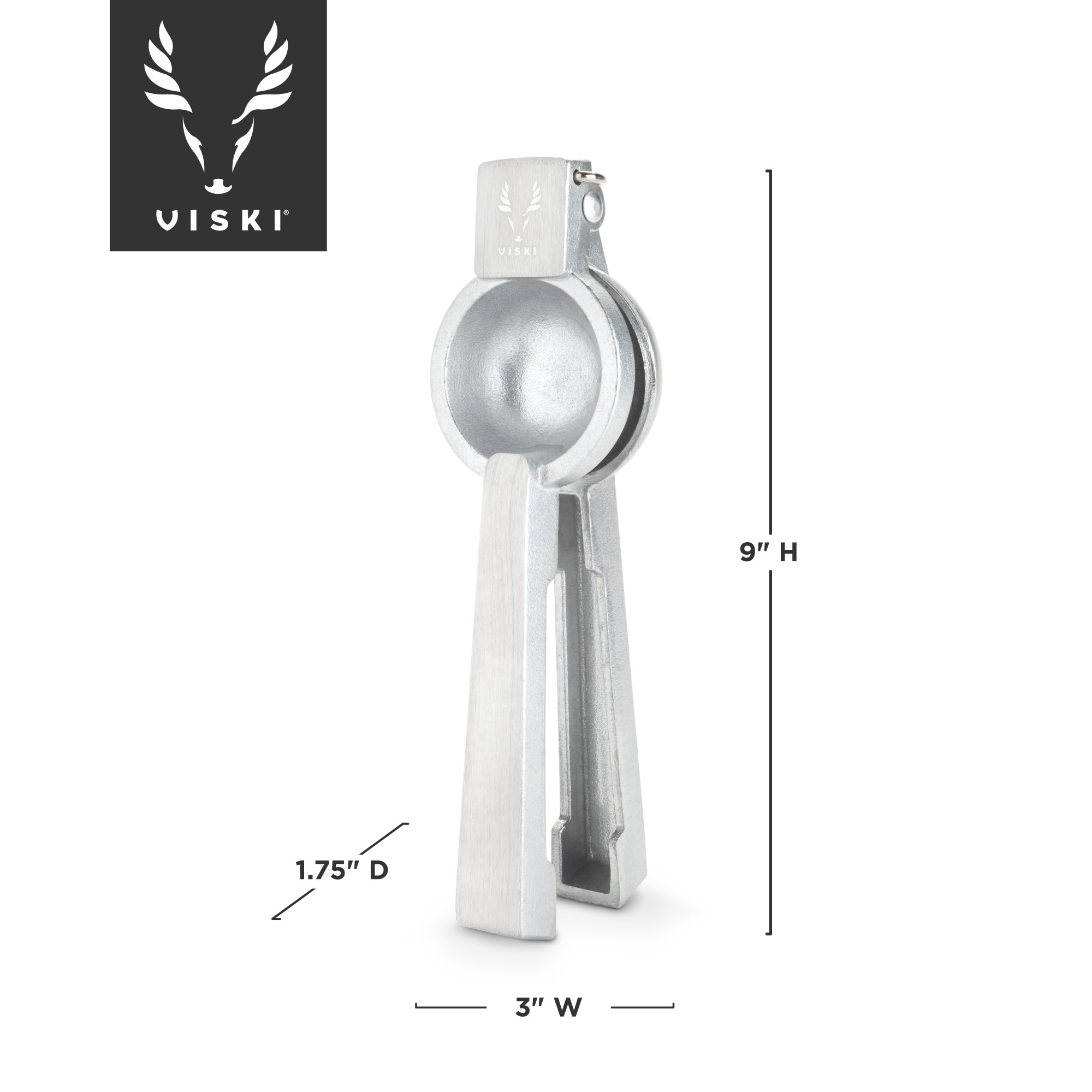 Turn citrus into a statement. The matte silver finish of this Citrus Press by Viski evokes sturdy industrialism while looking refined and sleek on a home bar cart or countertop. Effortless citrus juicing will upgrade your bar game. Don’t rely on bottled lime or lemon juice; they lack that ephemeral fresh flavor that takes cocktails from good to great. Taste the difference in your next whiskey sour, classic gin gimlet, daiquiri, mojito or Moscow mule. Sized for smaller citrus including lemons and limes, the Professional Citrus Press by Viski is a functional bar accessory that looks as good as the drinks you make with it.