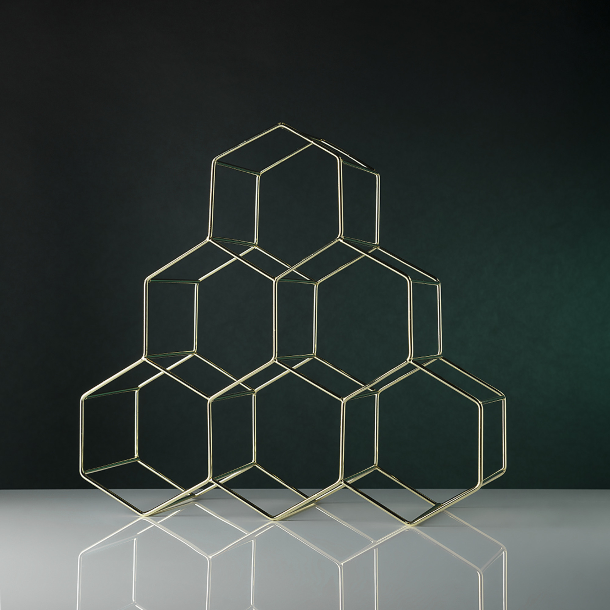 An excellent selection of wine deserves to be displayed in style. Gold-plated iron is wrapped and welded to form this stunning six bottle wine rack, perfectly suited for tabletops, countertops and that meticulously curated bottle collection. Geometric honeycomb design Gold-plated iron Holds 6 standard wine bottles 14.25" x 15" x 6" Stylish and practical, this glamorous wine rack brings subtle elegance to your home decor. Upgrade your barware with Viski’s professional-quality home bar accessories.