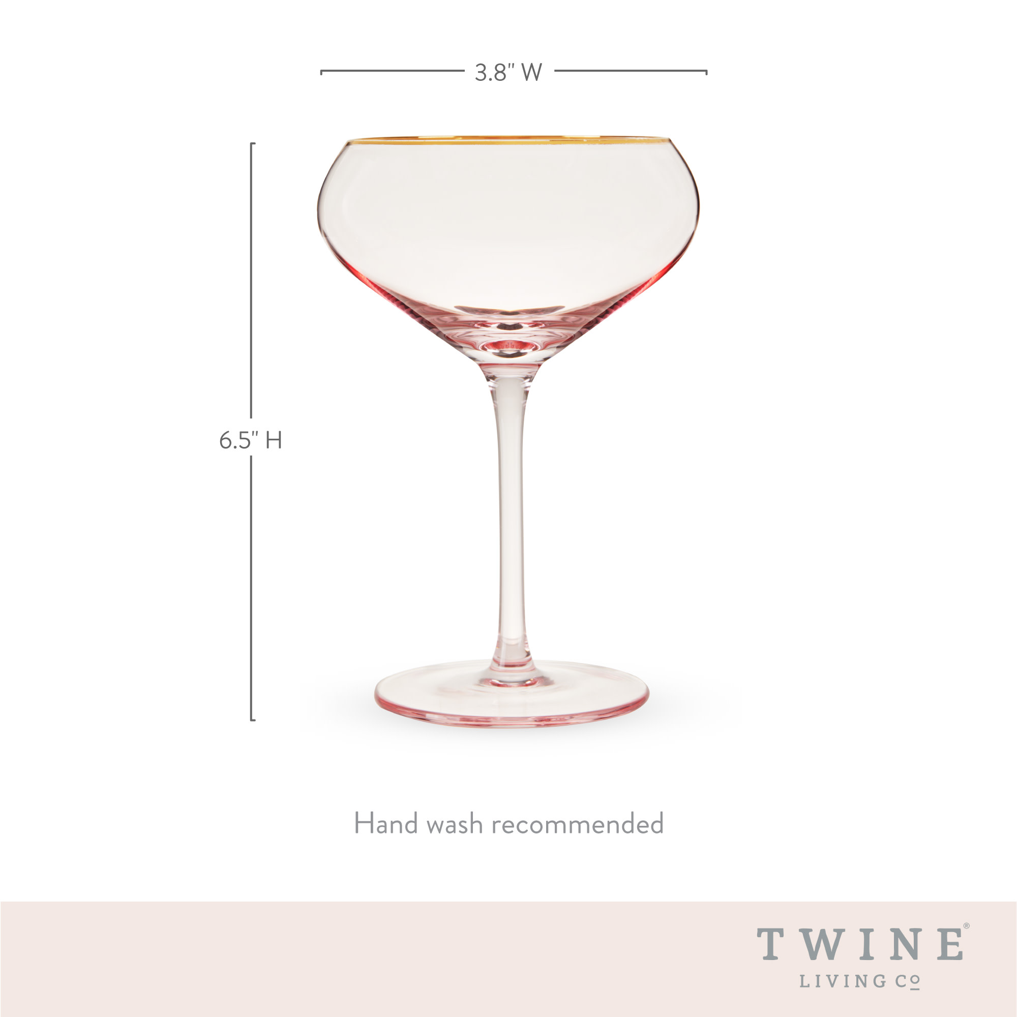 Life looks a lot rosier when you sip from these gold-rimmed coupe glasses. Tinted a delicate pink, these crystal glasses are the perfect vessels for your favorite cocktail and make great espresso martini glasses set of 2, alcohol glasses for wine, manhattan glasses, or cute cocktail glasses for any cocktail served up. This pink glasses drinking set make the perfect kitchen bar glasses for special occasions or make a great gift for anyone who loves colored glassware sets. Hand wash recommended. Set of 2. Holds 11.5 oz. Crystal.