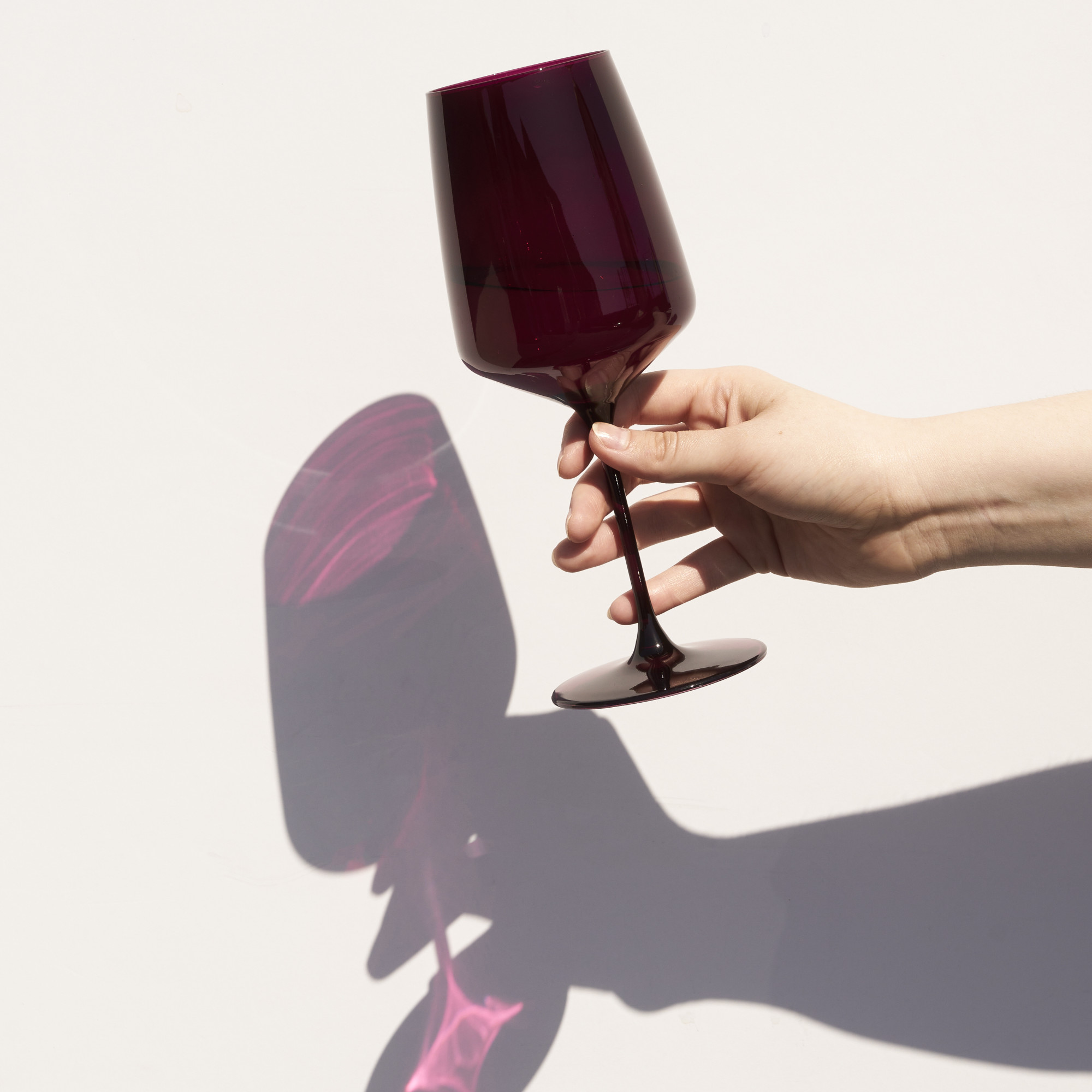 Enjoy your wine in gorgeous multi-colored wine glasses. Crafted from European crystal, these stemmed wine glasses have a modern, angled silhouette with elegant stems and come in four striking hues: Smoke, Garnet, Berry, and Amber. Set of 4 glasses. European lead-free crystal. 22 oz. capacity. Hand wash recommended.