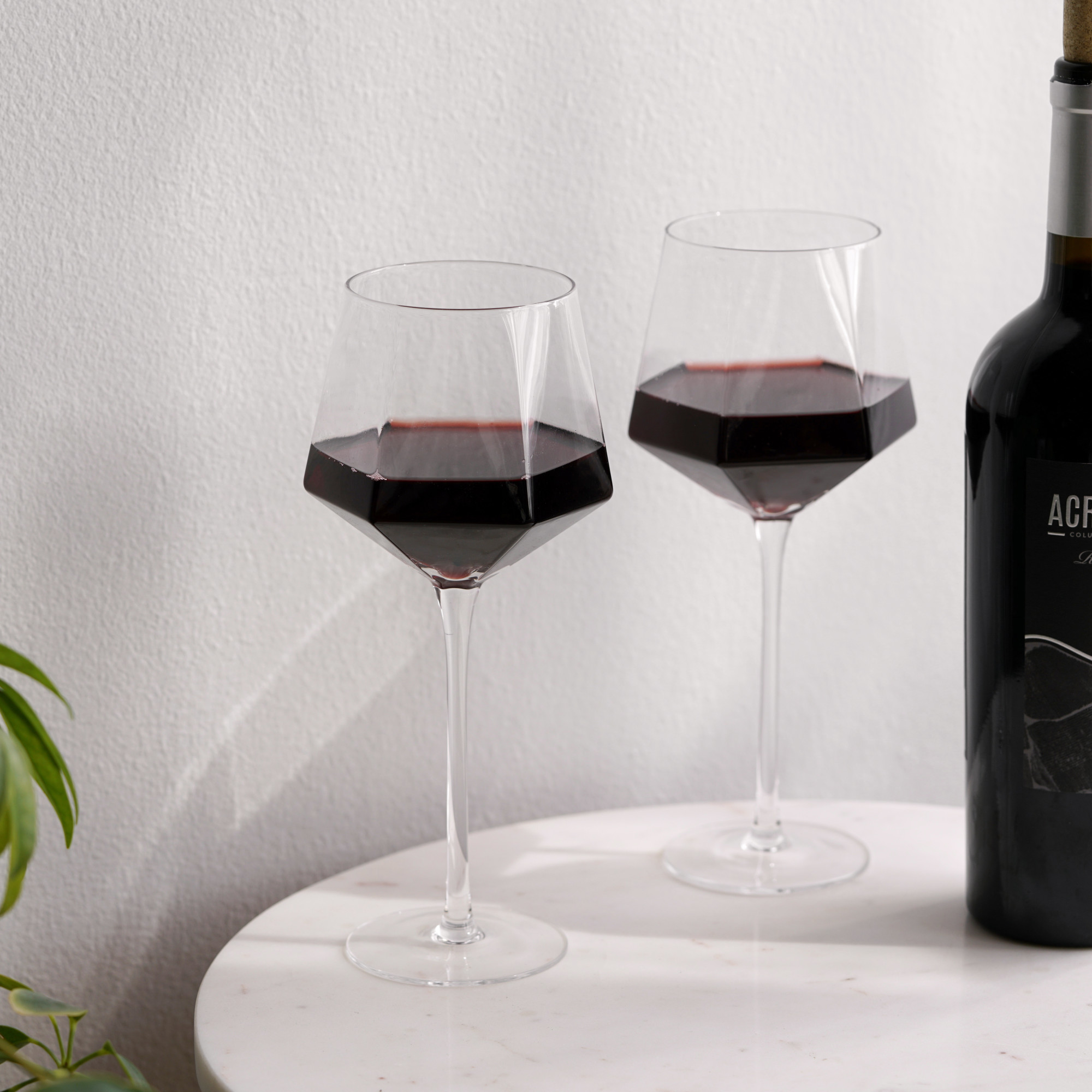An angled base, faceted diamond design, and perfectly clear crystal give this set of wine glasses an otherworldly sparkle. Add contemporary glam to your favorite red wine, white wine, or rosé with this stemmed glassware.